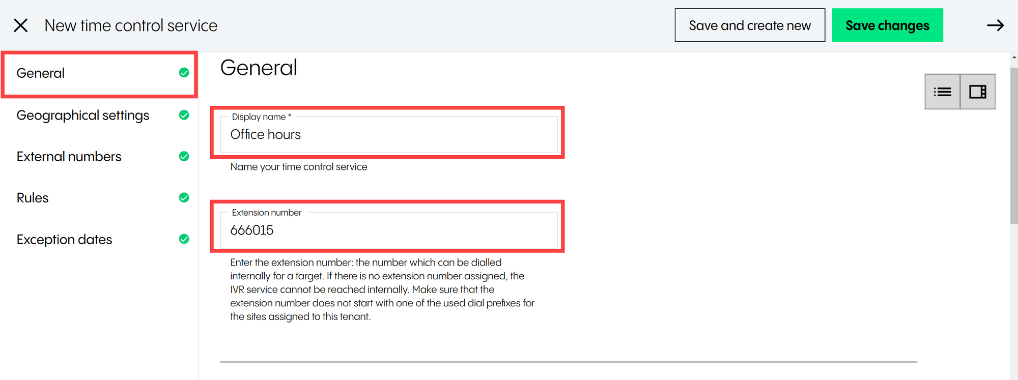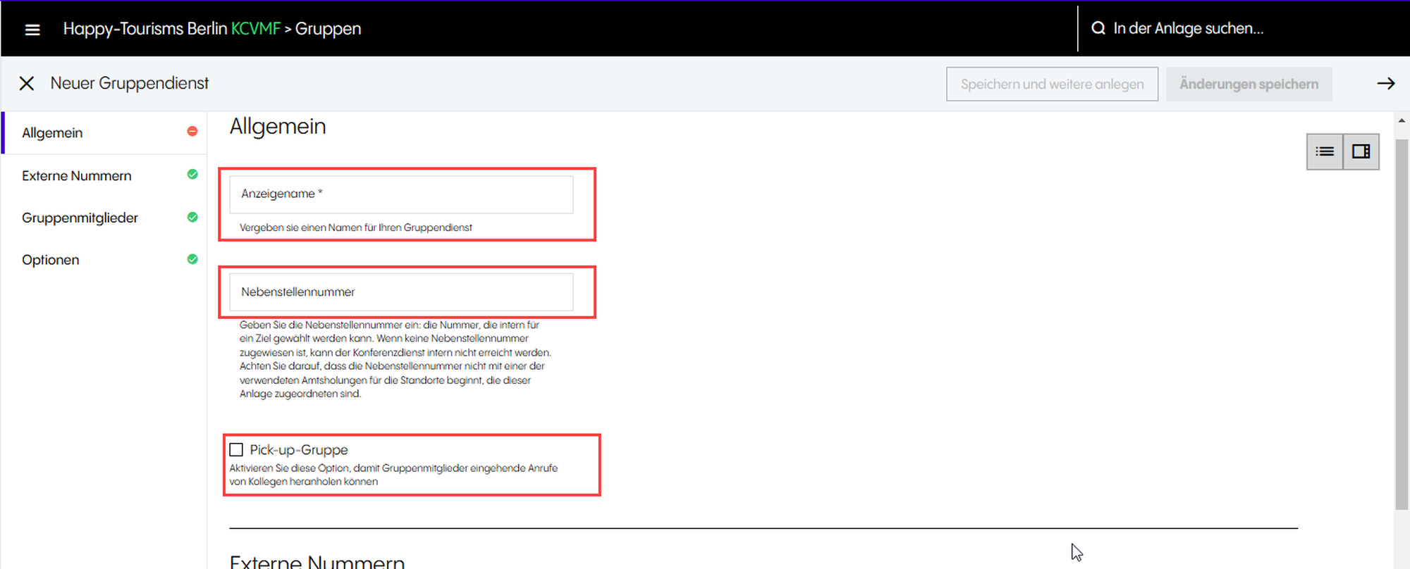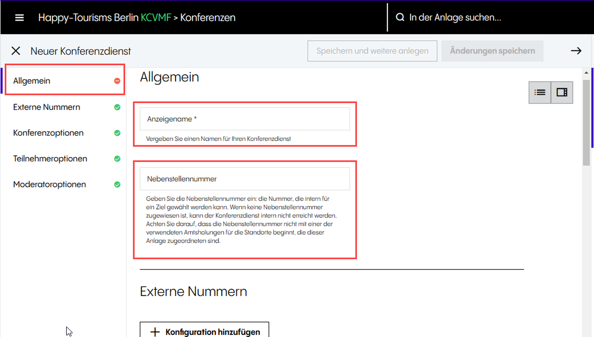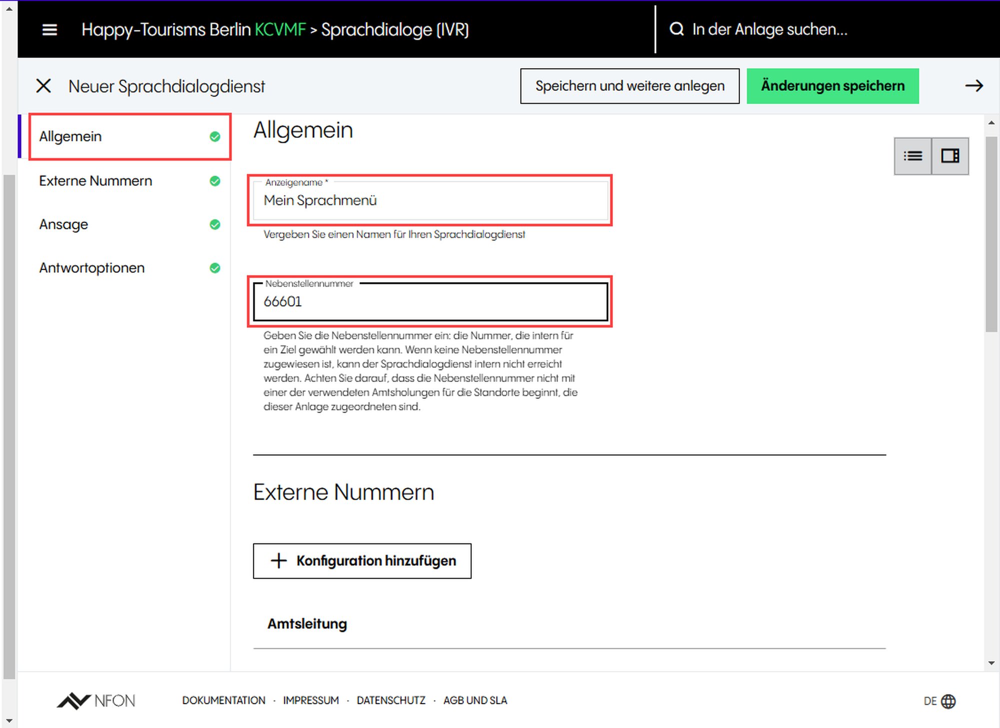 Unter Externe Nummern können Sie eine oder mehrere Durchwahlen (für eingehende Anrufe) zum Sprachdialogdienst hinzufügen.