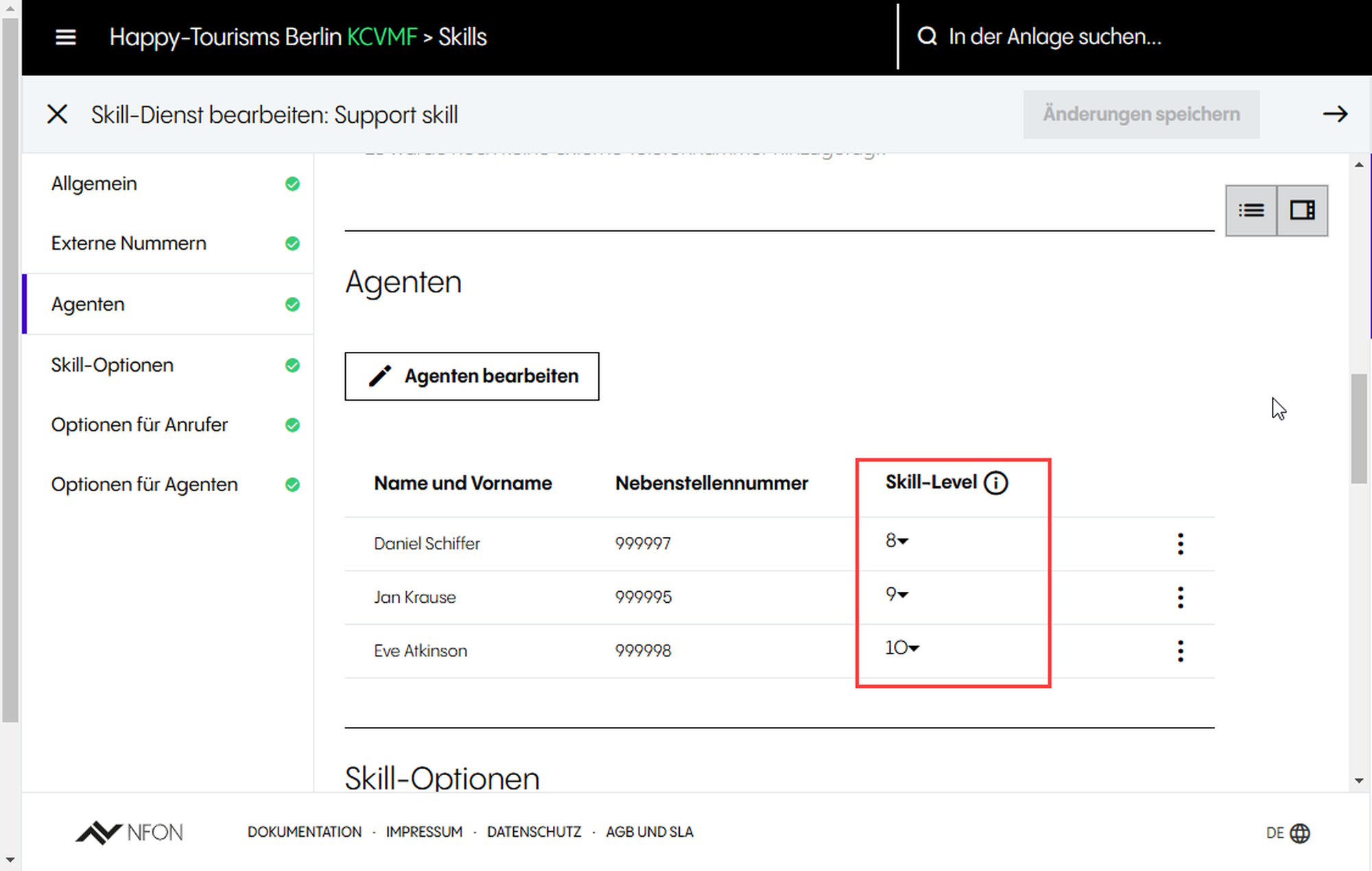 Unter Nebenstellen > Nebenstellen > Skills, können Sie einsehen, in welchen Skills ein Agent Mitglied ist. Ein Administrator kann über den Button den Agenten als Mitglied eines Skill-Dienstes aktivieren oder wieder deaktivieren, so dass der Agent keine Anrufe erhält, auch wenn er am Skill-Dienst angemeldet ist. "Am Skillset als Agent einloggen“ nimmt den Agenten in das Skill-Set auf. Wenn also ein Agent sich mit einem Sterncode vom Skillset abgemeldet hat, kann ein Administrator den Agenten mit dieser Option anmelden.