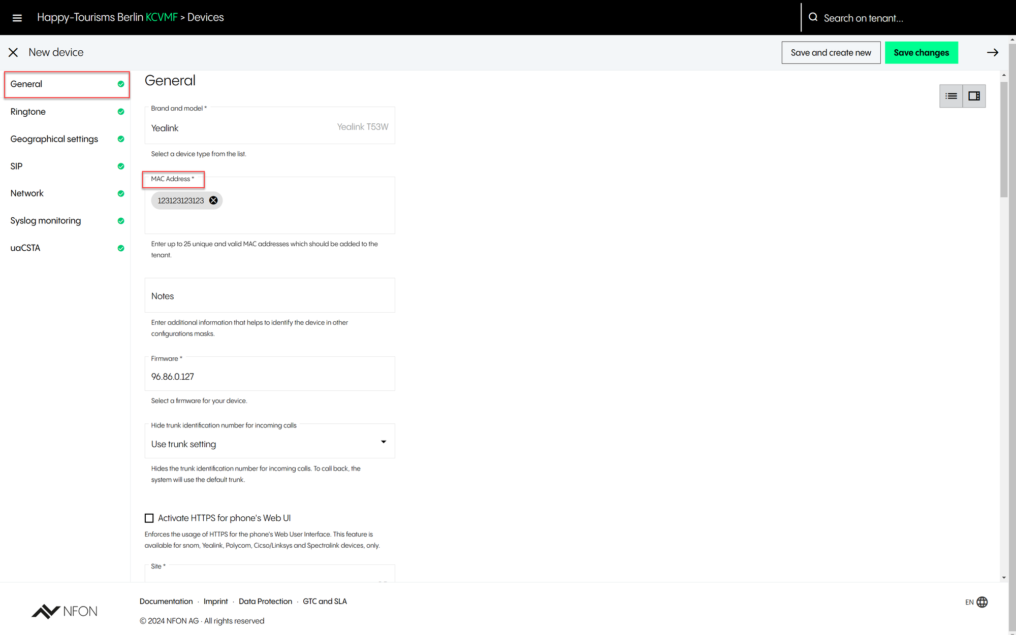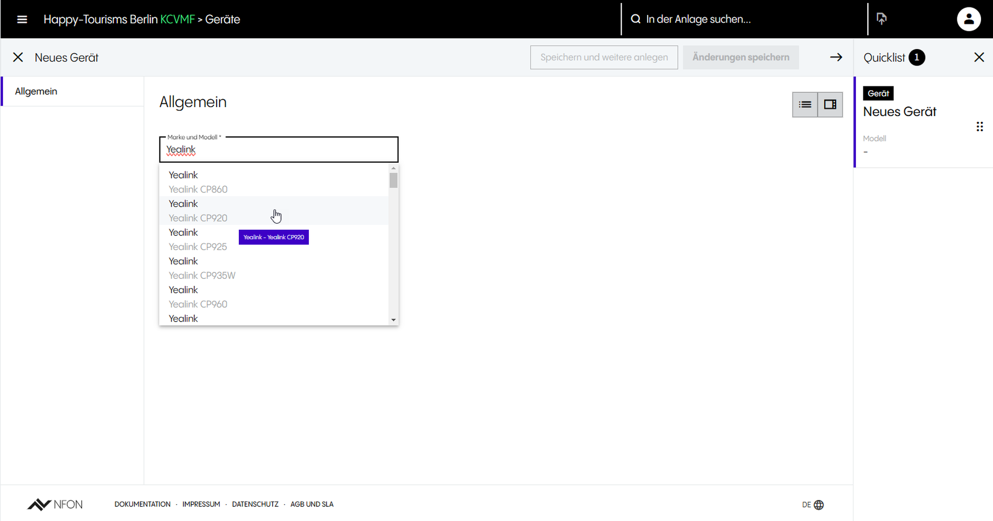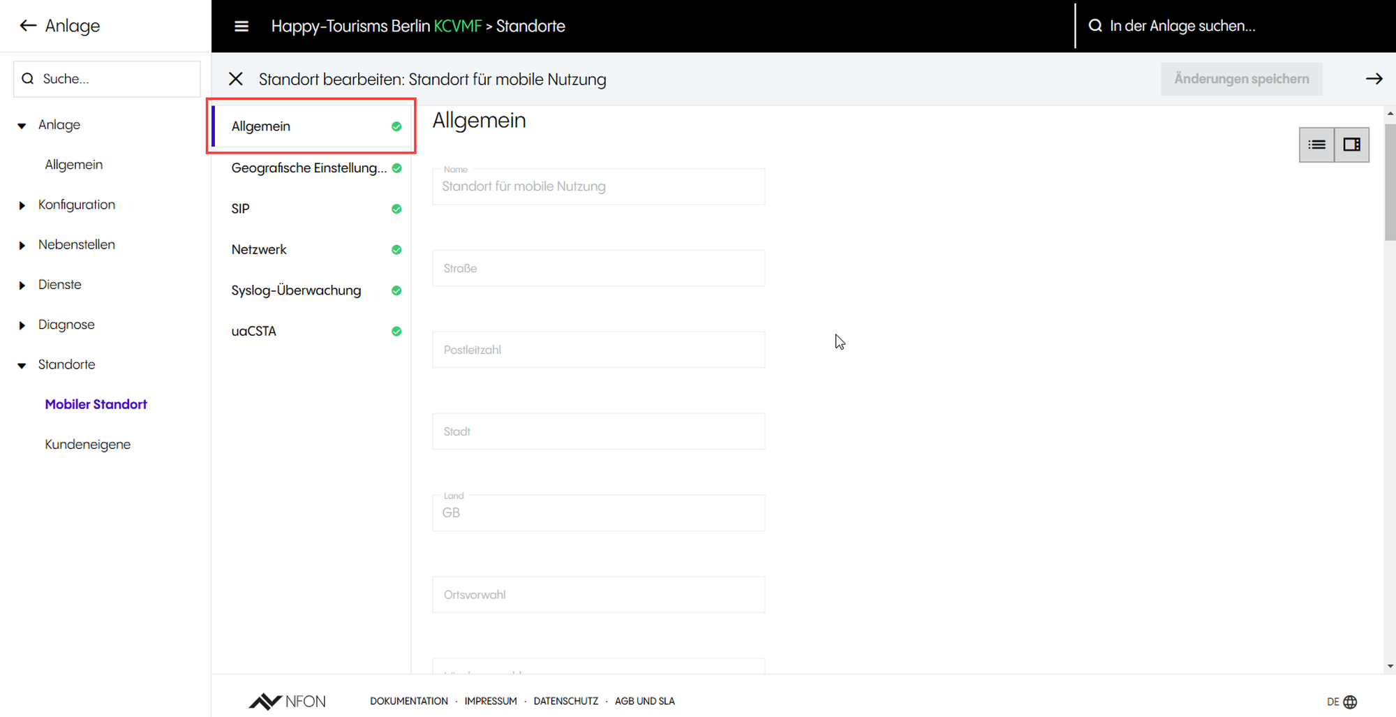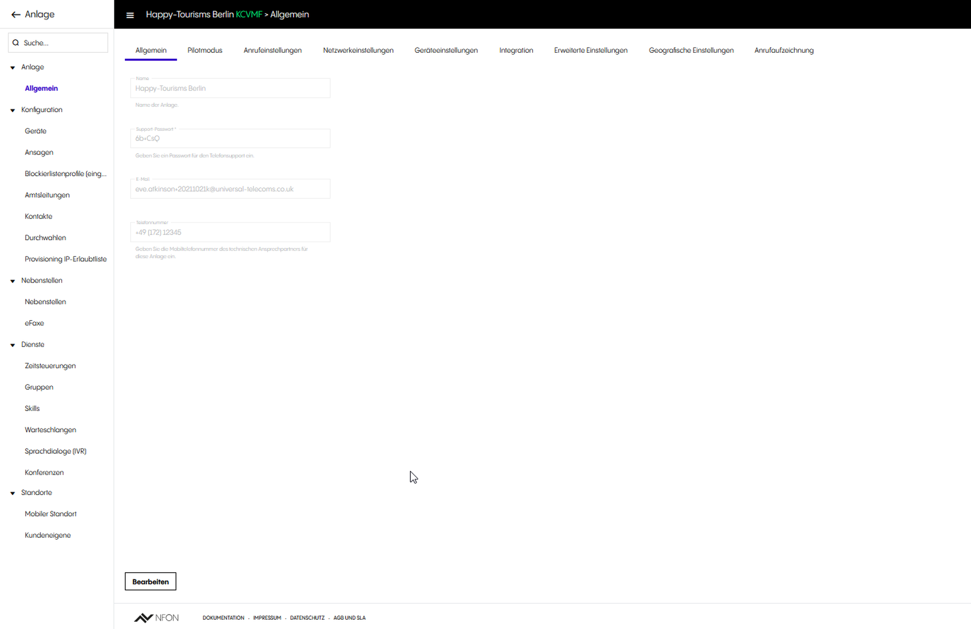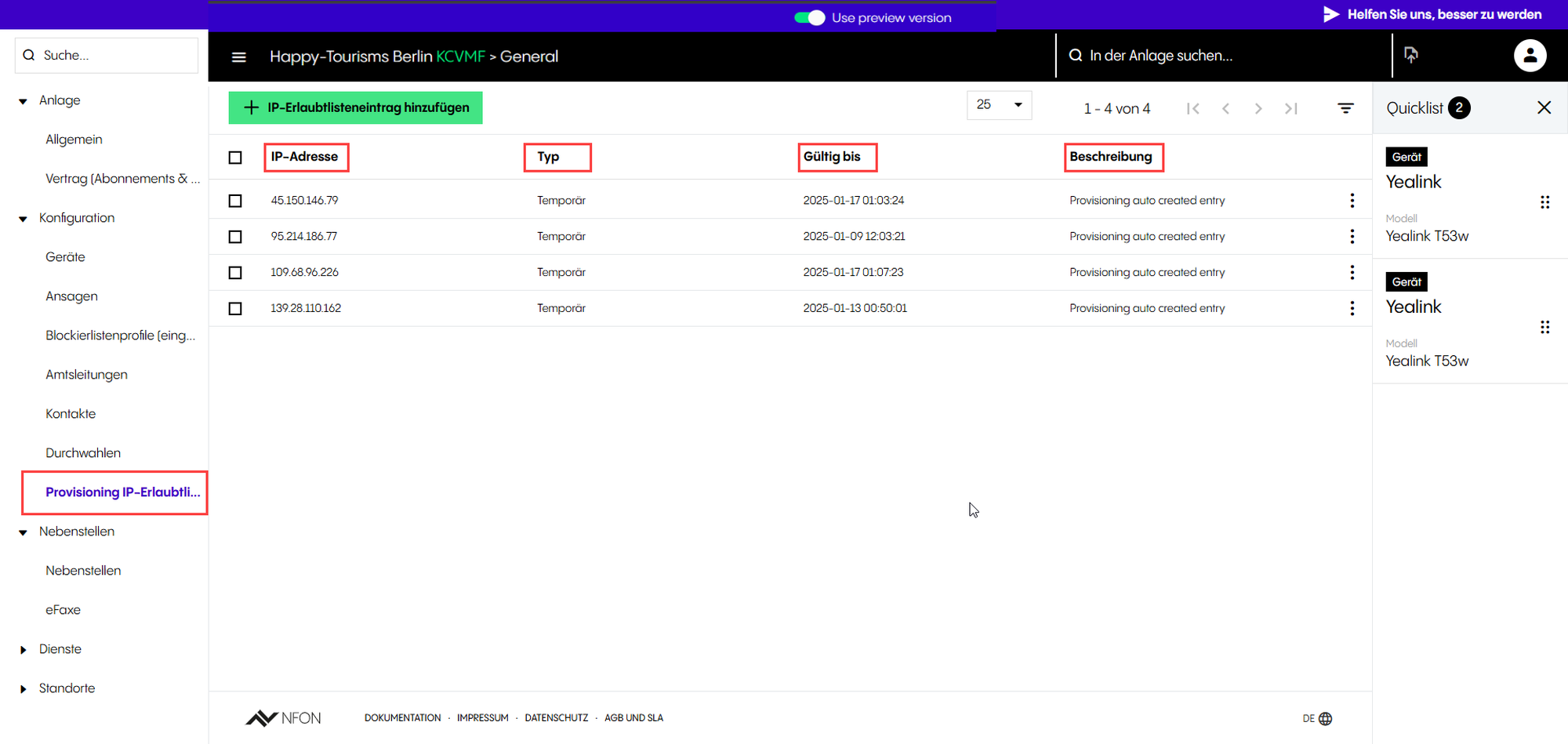 Konfiguration (Geräte, Ansagen, Blocklistenprofile für eingehende Anrufe, Amtsleitungen, Kontakte, Durchwahlen und Provisioning IP-Erlaubtliste)