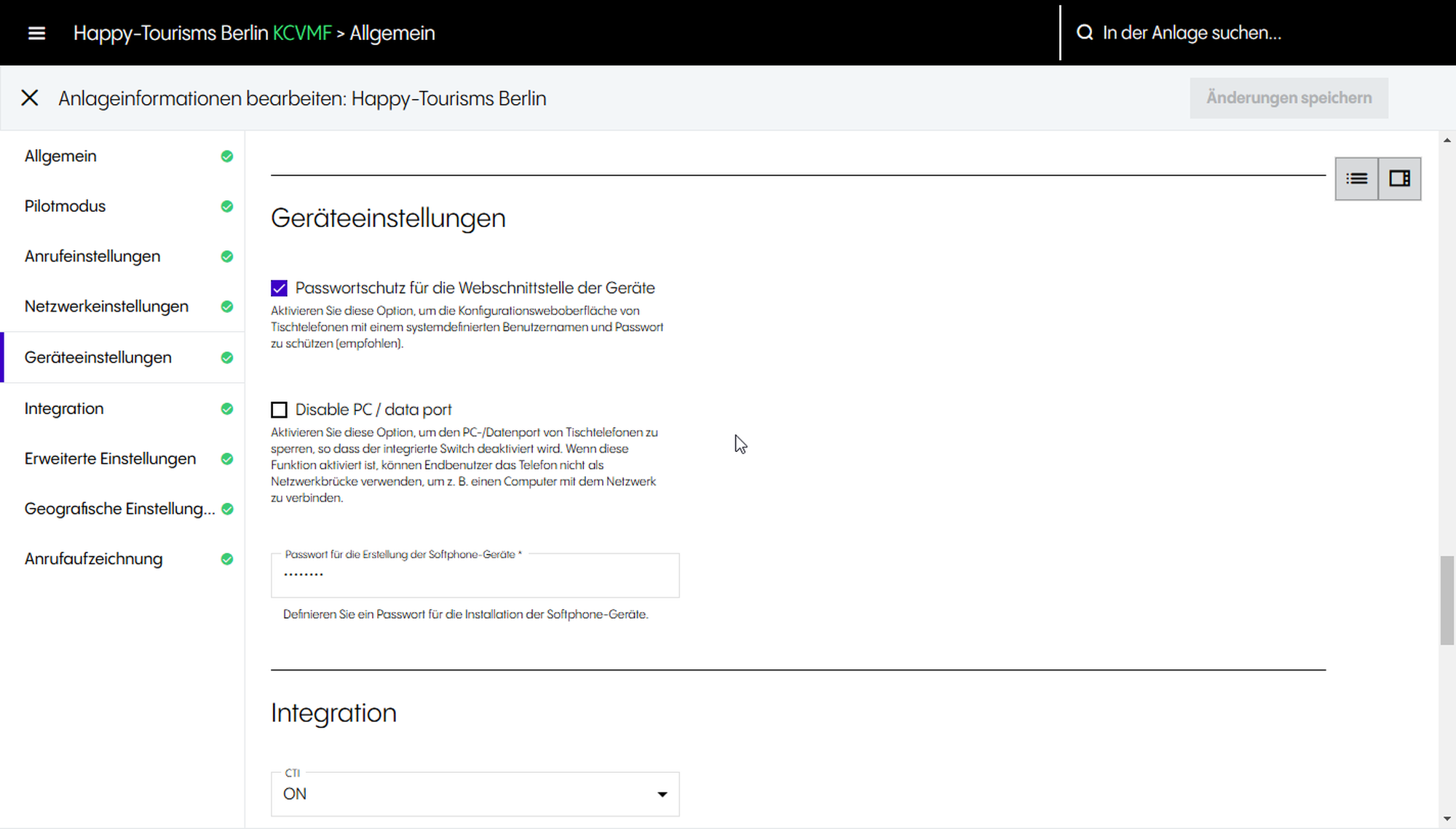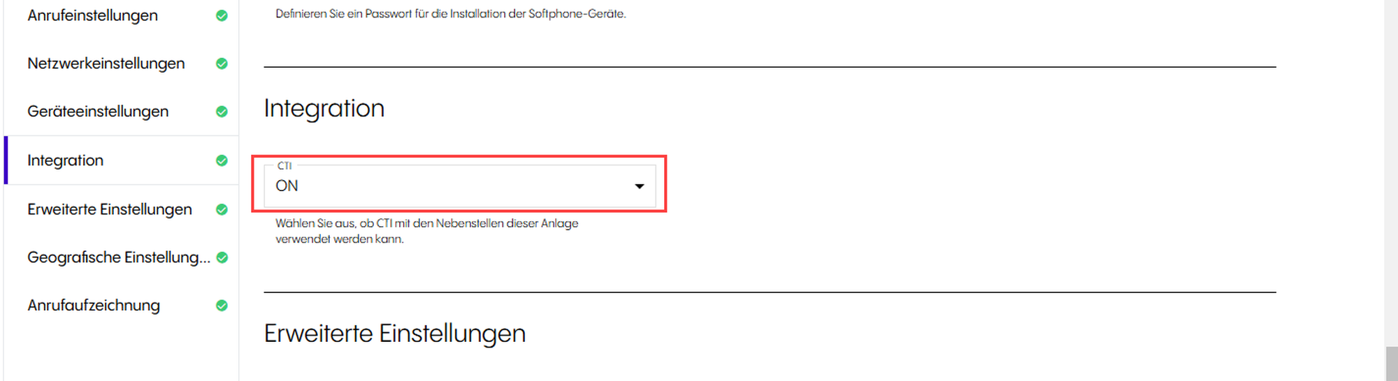 Unter Integration können Sie sehen, ob CTI an der Anlage aktiviert oder deaktiviert ist (schreibgeschützt). Um es auf einem Ziel zu aktivieren, muss diese Einstellung später unter Nebenstellen konfiguriert werden.