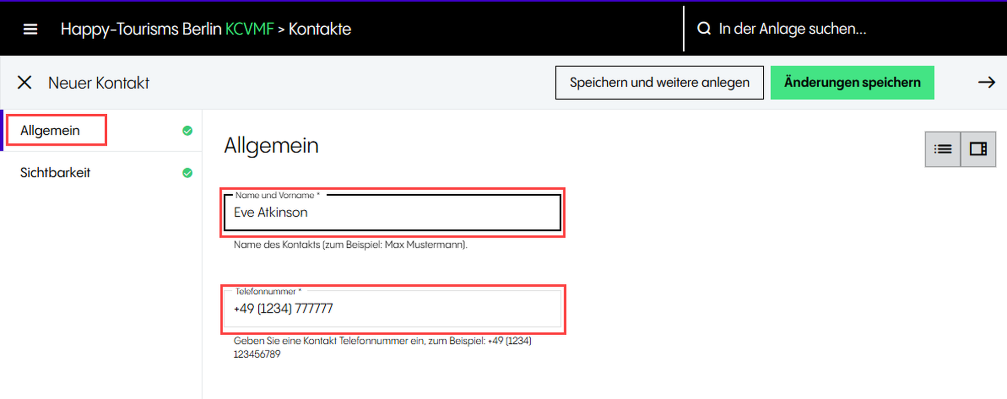 Name und Vorname | Weist dem Kontakt einen Namen zu. |