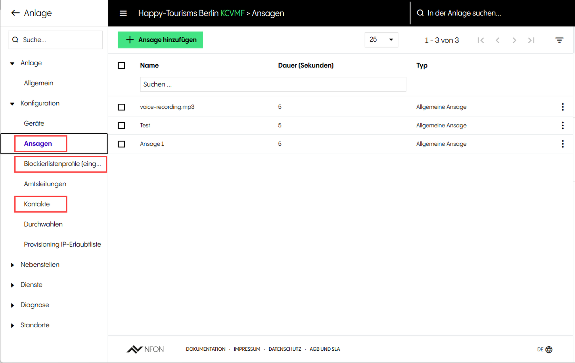 Unter Konfiguration > Ansagen können Sie eine Liste aller Ansagen einsehen, die an der Anlage hinzugefügt wurden. Bitte beachten Sie, dass Ansagen, die in anderen Bereichen der Konfiguration hochgeladen wurden, z. B. in einer Warteschlange oder einem Sprachdialogdienst, ebenfalls aufgelistet sind und in diesem Abschnitt verwaltet werden können.