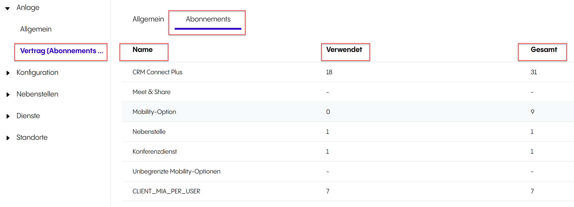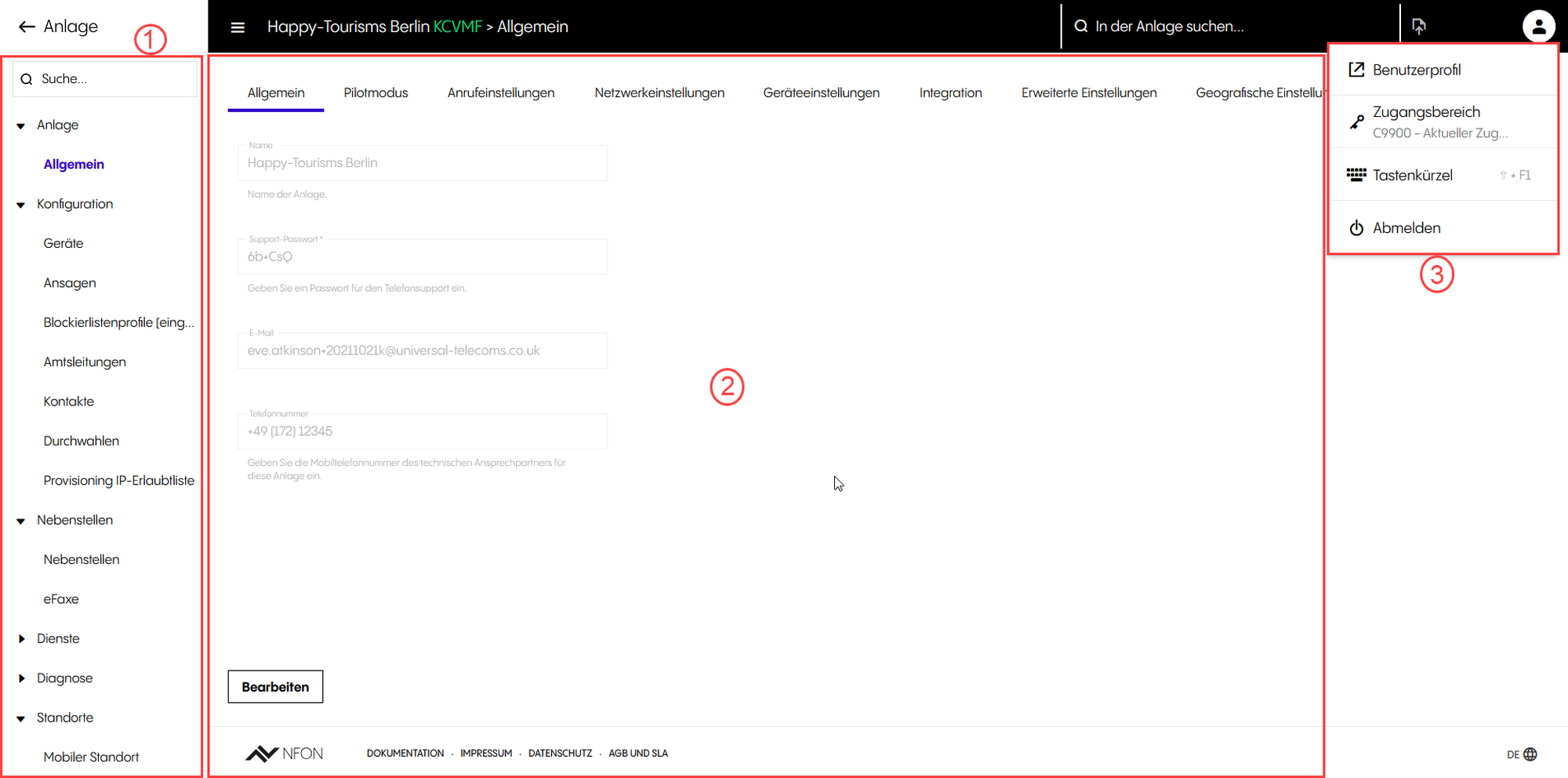 Im Hauptmenü auf der linken Seite finden Sie 5 Bereiche (in diesem Beispiel; dies kann je nach Vertrag, Berechtigungen, Konfiguration usw. variieren):