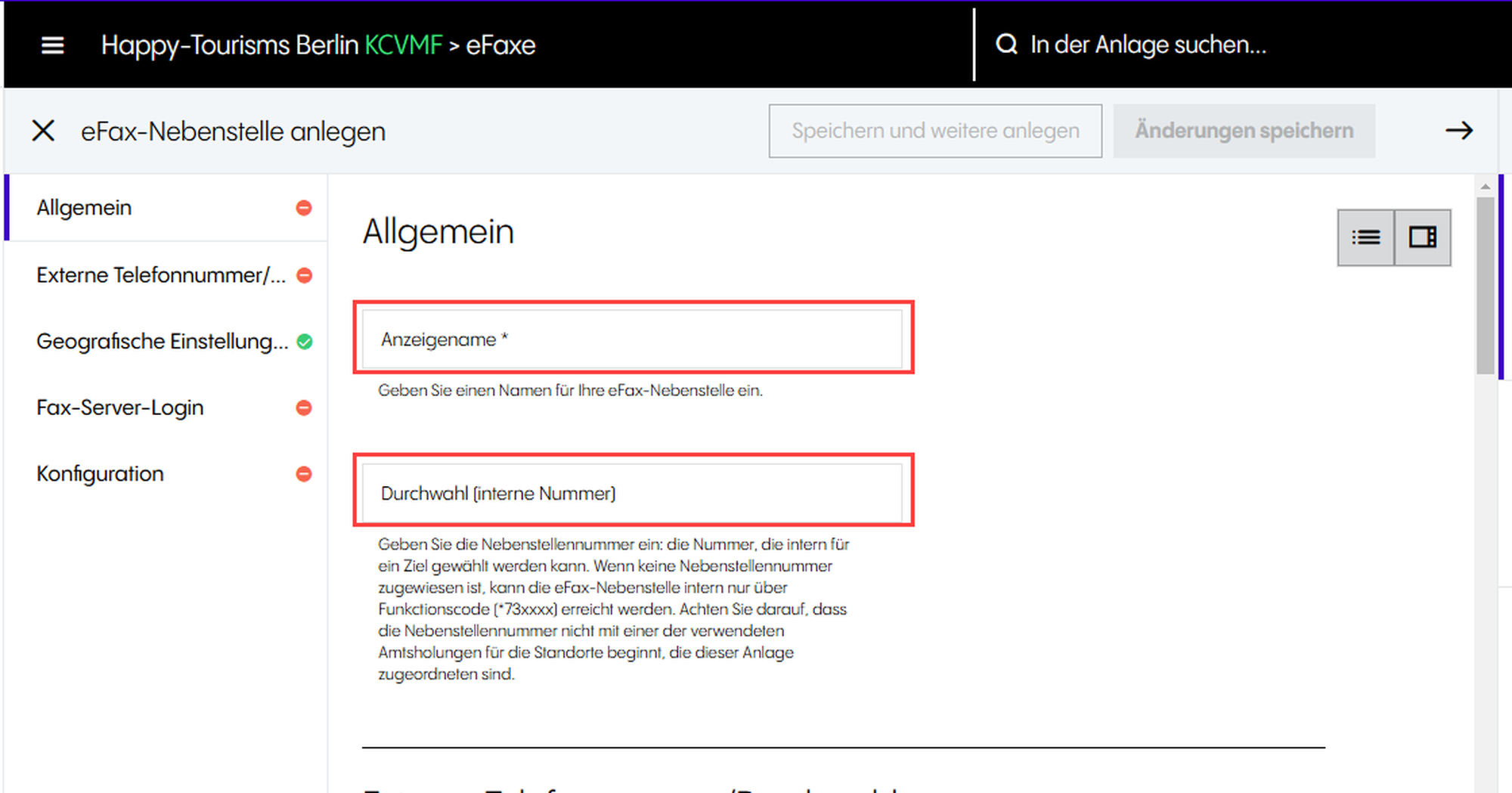 Anzeigename | Dies ist ein Pflichtfeld und kann bis zu 50 Zeichen lang sein. Es gelten die gleichen Regeln wie im Abschnitt Telefonnebenstellen. |