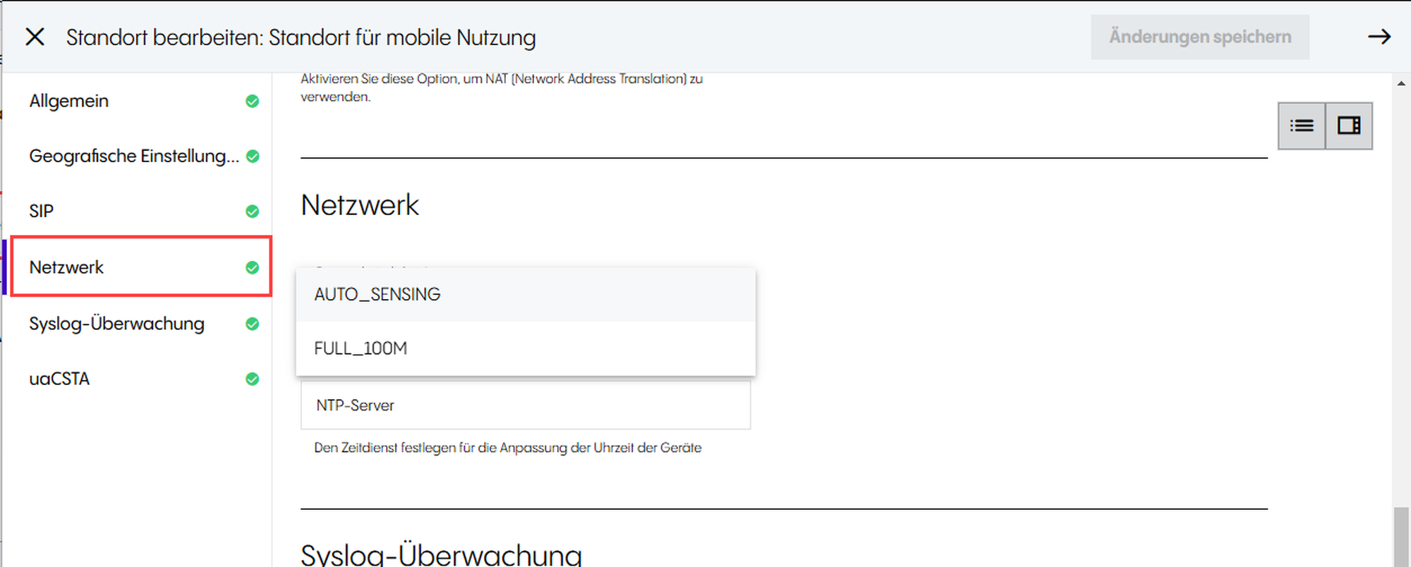 SIP-Transportprotokoll | Ermöglicht die Festlegung, über welches Transportprotokoll Geräte/Apps dieses Standorts kommunizieren. Bitte beachten Sie, dass TLS in der Regel eine kostenpflichtige Funktion ist, die pro Gerät berechnet wird. Bitte beachten Sie, dass beim Zurücksetzen dieser Einstellung alle vom Endbenutzer zertifizierten Geräte neu gebootet werden. |