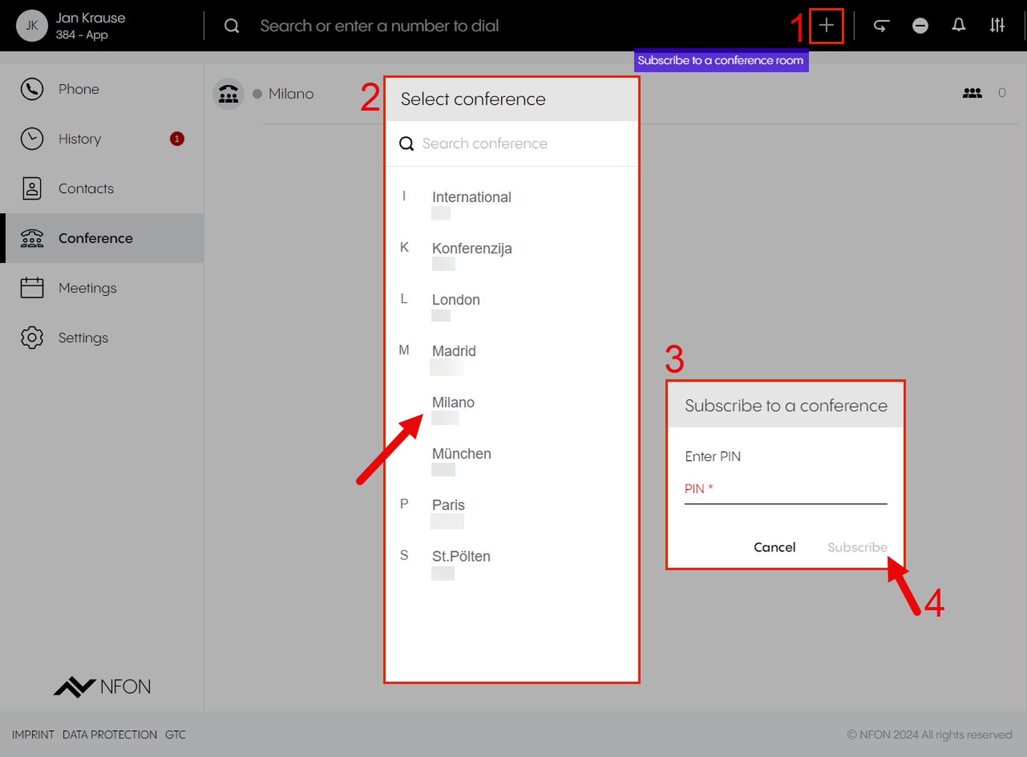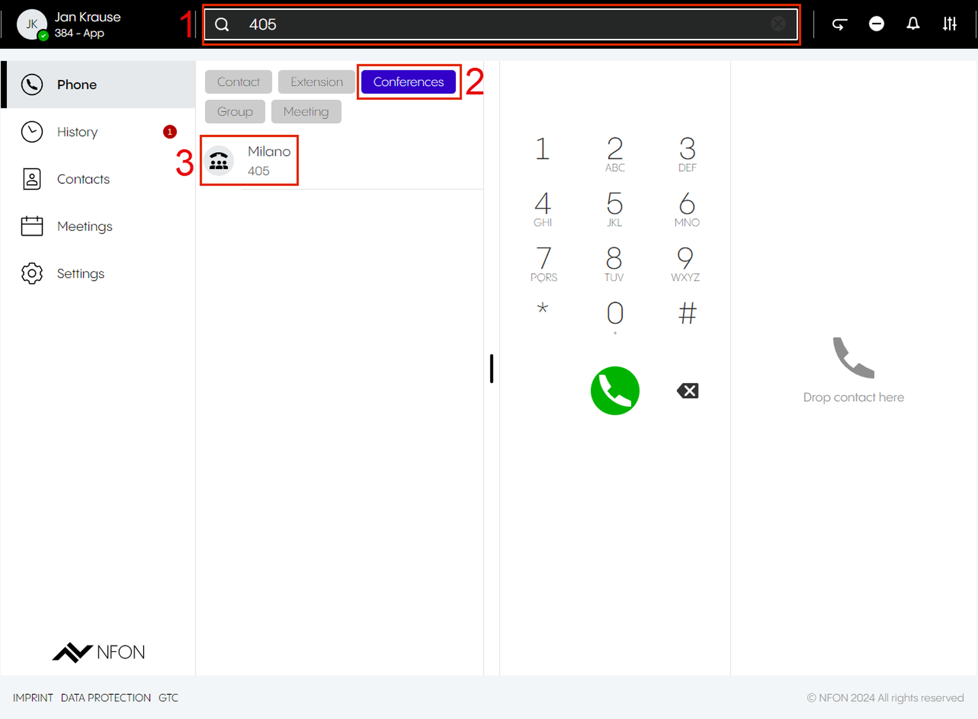 2. Öffnen Sie das Optionsmenü in der oberen rechten Ecke. Wählen Sie die Option DFN VoIP Centrex Meet&Share und klicken Sie auf Meeting hinzufügen.