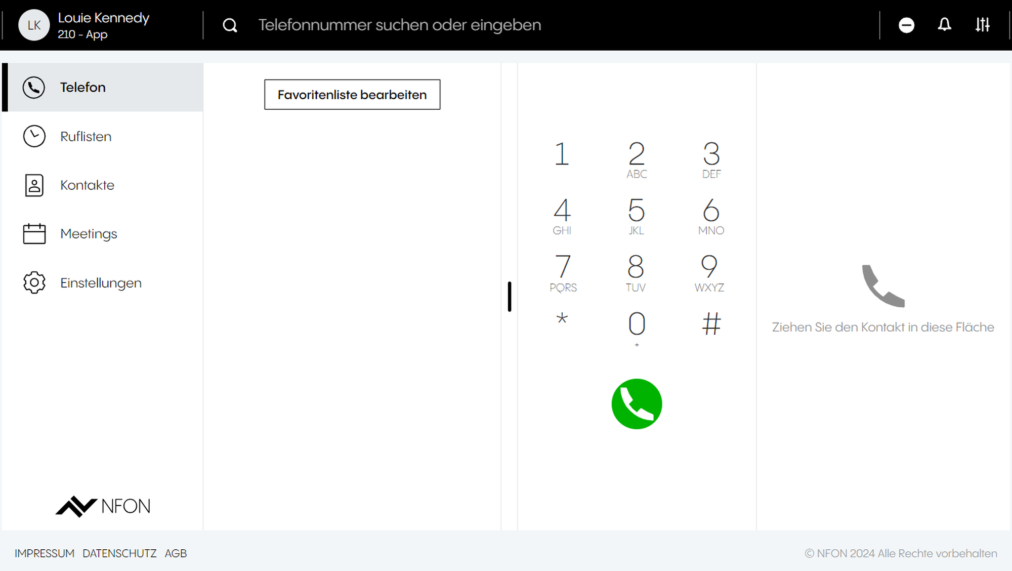 Ist das App-Menü eingeklappt, sehen Sie oben links Ihren Namen und das ausgewählte Endgerät, mit dem Sie telefonieren.