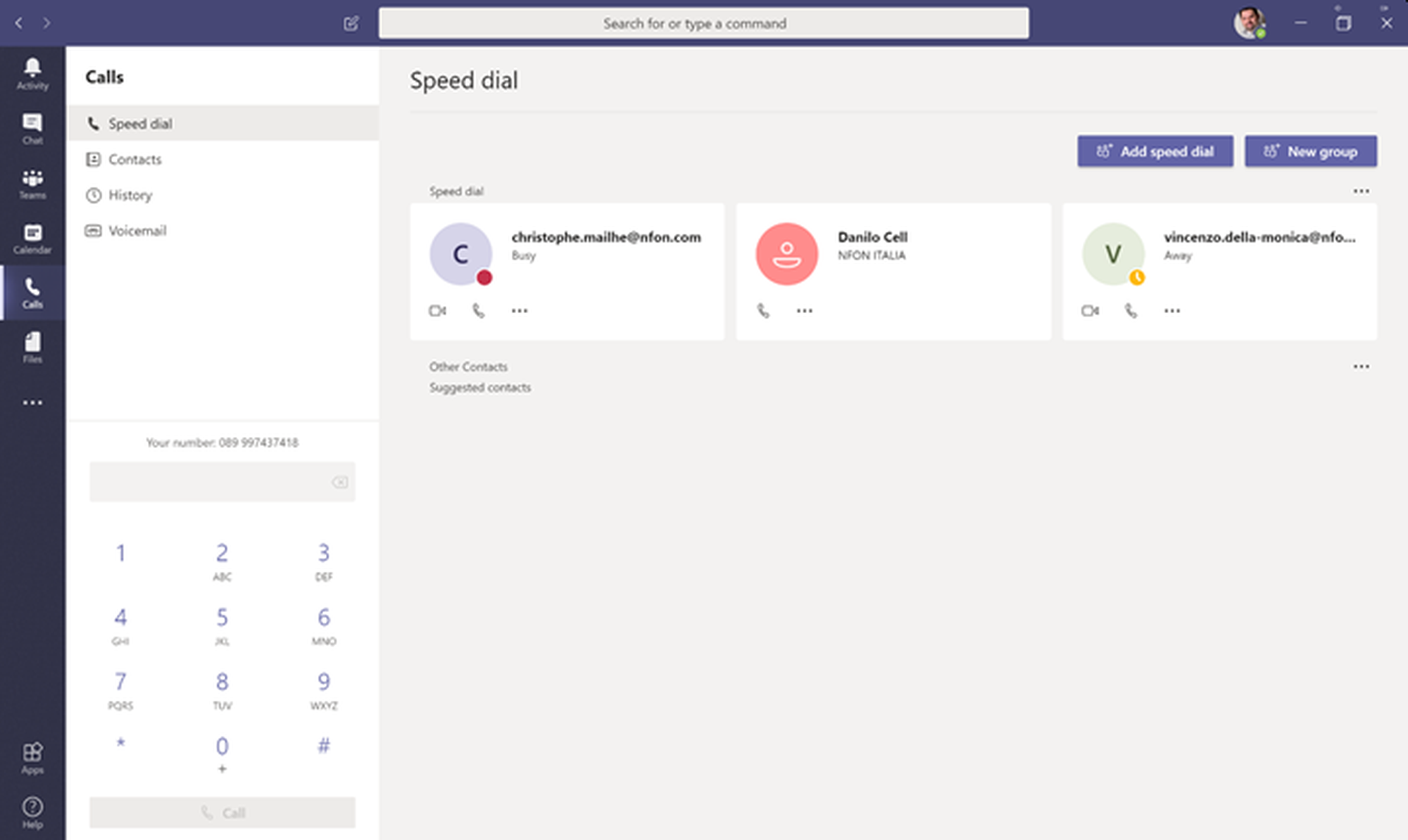 Die Microsoft Teams-Clients werden als Softphones eingesetzt, die mit der Plattform (über das Microsoft-Telefonsystem und Direct Routing) verbunden sind. Dies ermöglich dem User, die Telefonie-Features für Unternehmen von DFN VoIP-Centrex bestmöglich zu nutzen (z.B. Queue- und ACD-Routing, NContactcenter etc.).