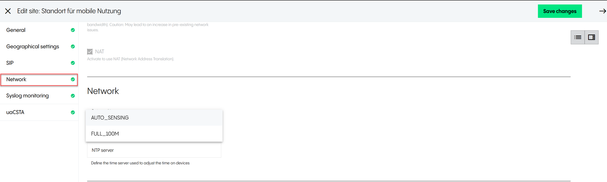 SIP transport protocol  | Allows defining over which transport protocol devices/apps on this site communicate. Please note that in most cases, TLS is a chargeable feature charged per device. Please note that if this setting is reset, all end-user certified devices will reboot.