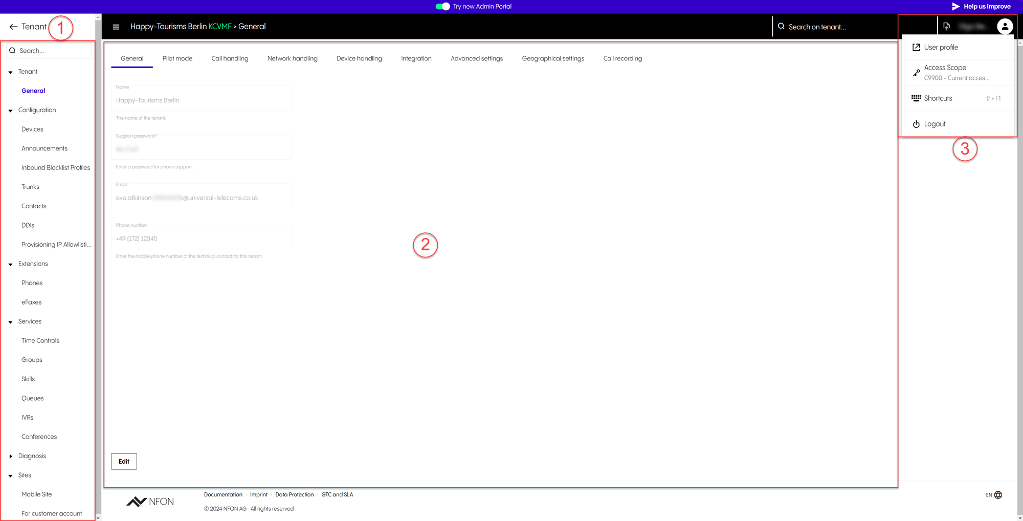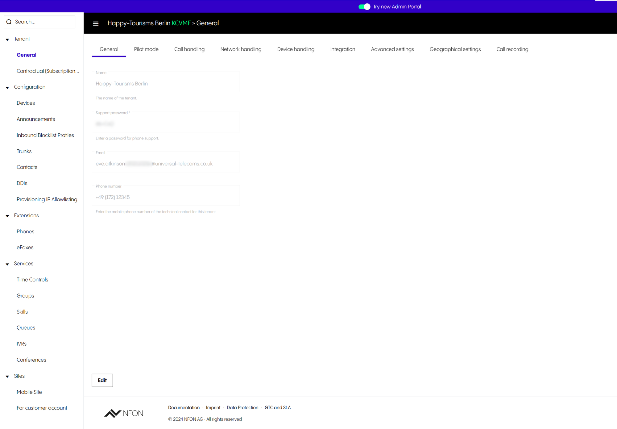 To use the Administration Portal, you have to log in with your DFN VoIP-Centrex username and password. These are the same credentials you would use at https://start.voip-centrex.dfn.de/en.