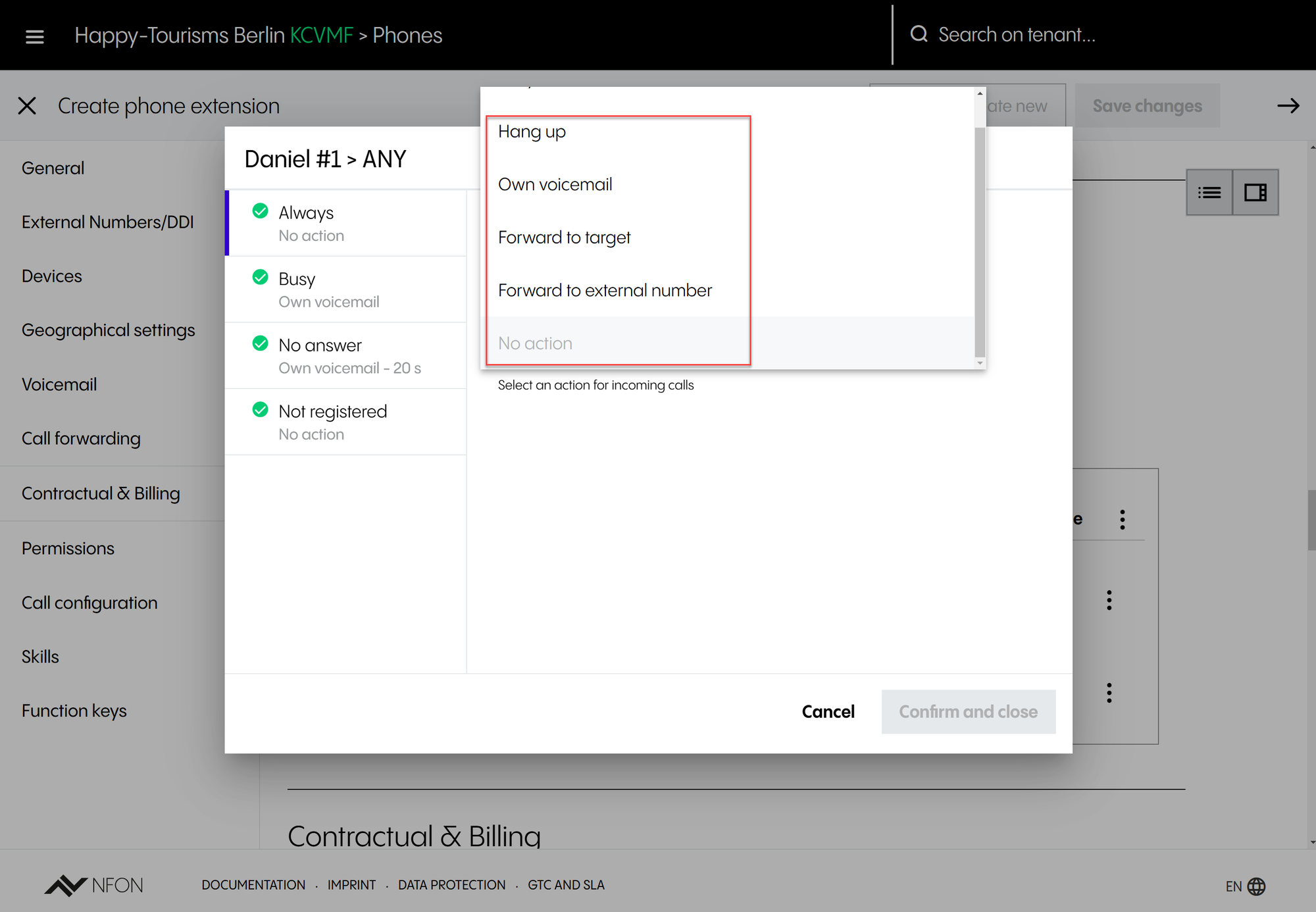 Use speed dial  | Activates/deactivates the use of speed dial. With speed dial, you can dial 2 followed by a number to select an entry of a pre-defined speed dial list. You can then set a speed dial length. This is the digit length of the speed dial codes for the customer. This can either be 1, 2, 3 or 4 digits. For example, by selecting a speed dial length of "2", up to 100 speed dials (00–99) can be added to the phone system, which can then be used by dialling 2+speed dial. By default, speed dial length is set to 9 which means that the feature is disabled. Please note that there is no msection in the Administration Portal to manage and maintain the list of speed dials. Speed dials must be uploaded as a .csv file. This option is available under Contacts and Extensions. When clicking on Import CSV, you can either import a file or download a template.  |