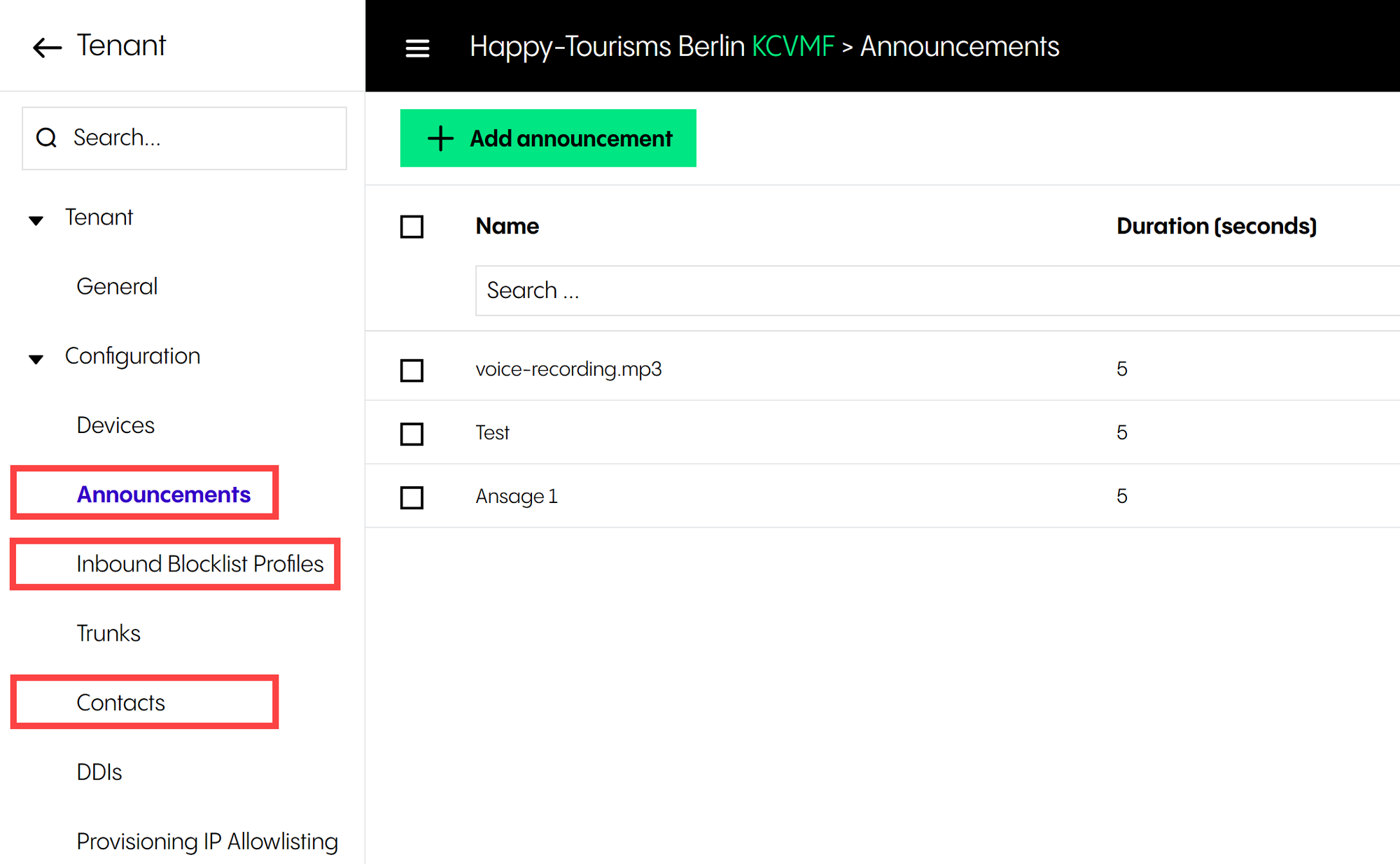 Under Configuration > Announcements, you can see a list of all announcements that have been added for the tenant. Please note that announcements which have been uploaded in other configurations screens, for example, a queue or an IVR service, are also listed and can be managed in this section.