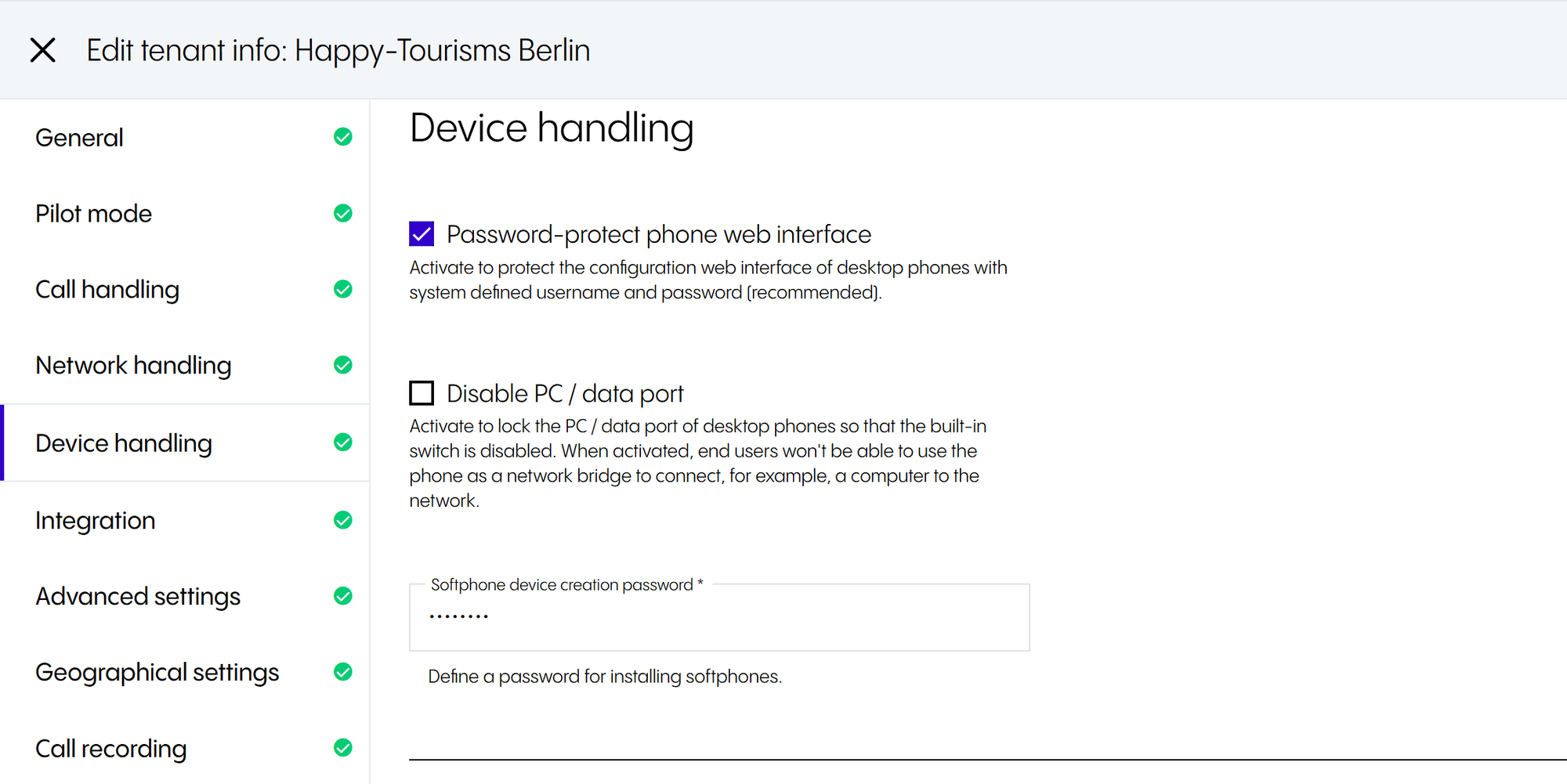 Softphone device creation password  | When you first install a softphone, you are required to enter this password during the setup process to authorise the installation. You have to change this password, as the default password is unknown.  |