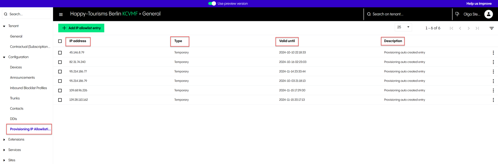 Configuration (Devices, Announcements, Inbound Blocklist Profiles, Trunks, Contacts, DDIs and Provisioning IP Allowlisting)
