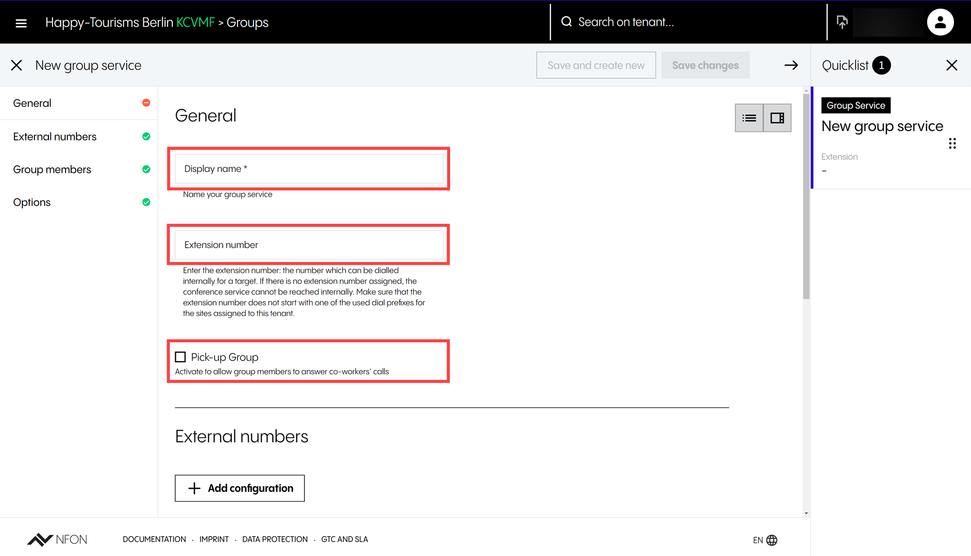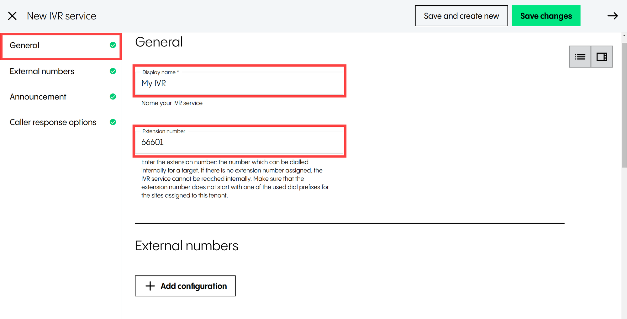 Under External numbers, you can add one or more DDIs (inbound numbers) to the IVR service.