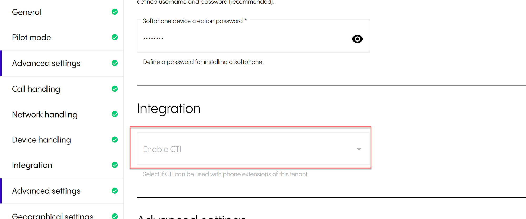 Under Integration, you can see whether CTI is activated or deactivated on the tenant (read-only). To enable it on a target, this setting must be configured later under Extensions.