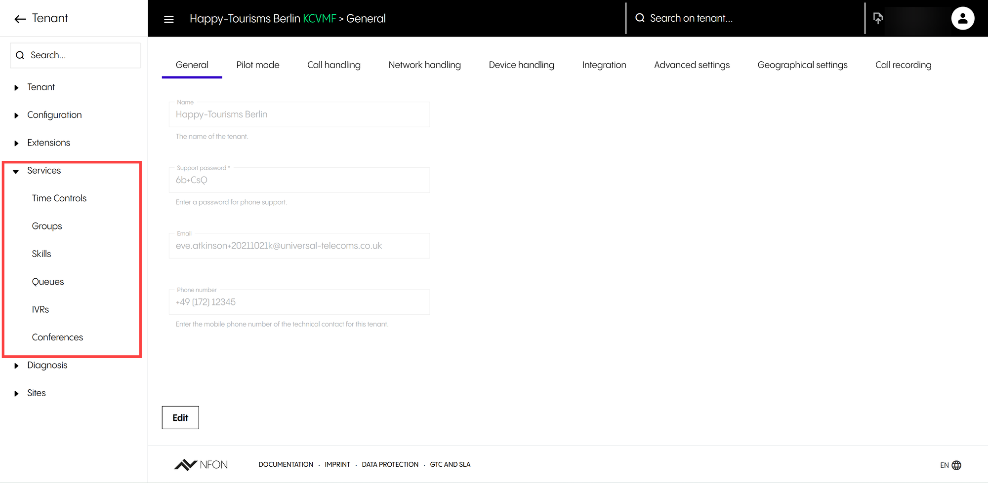 Support password  | Password the technical contact has to provide when contacting the Support Team to identify they have access rights to the account. It is defined when the tenant is created but can be changed at a later date.  |