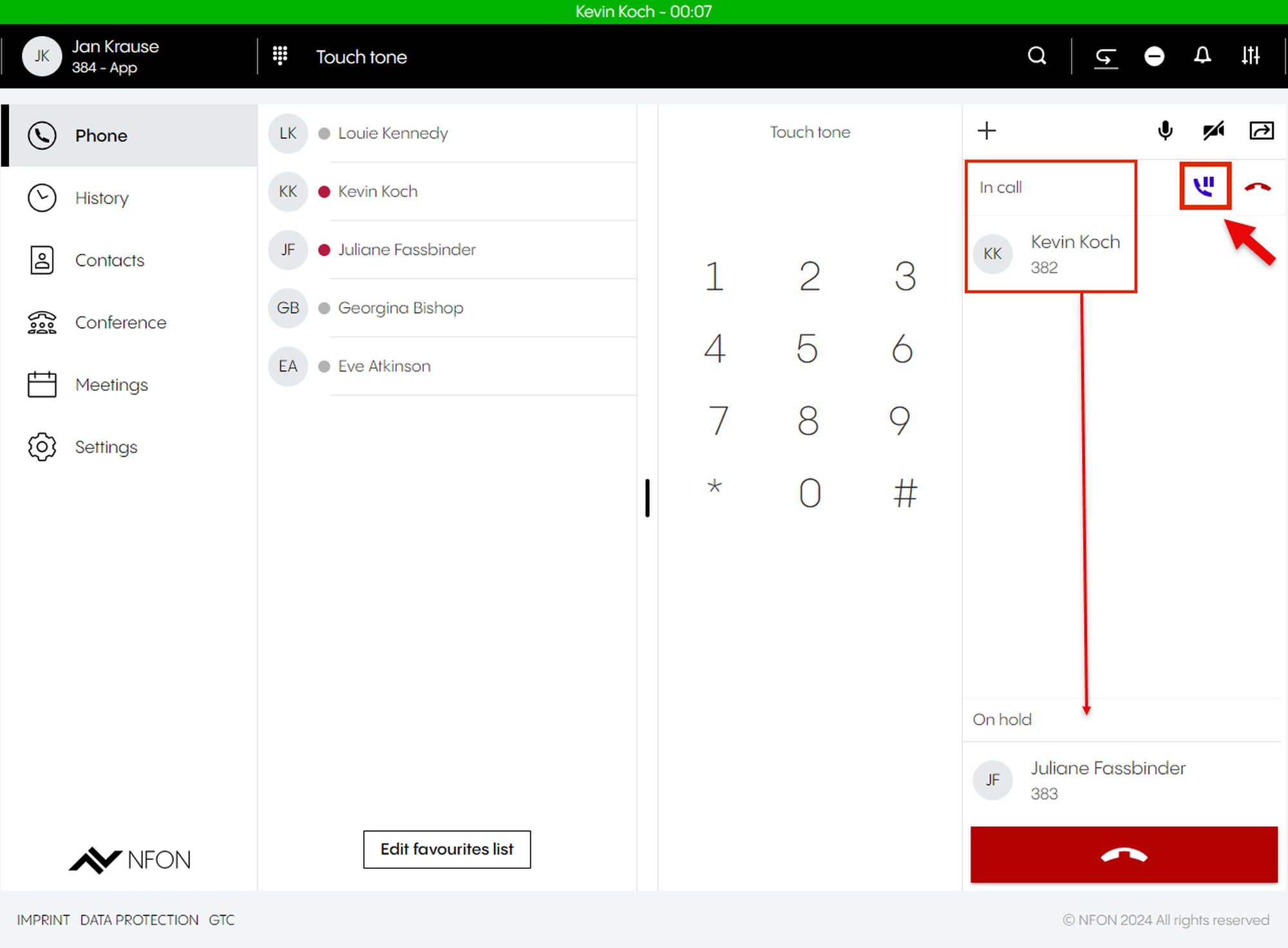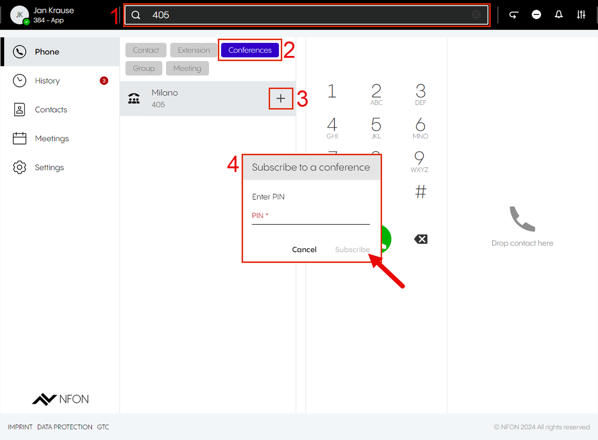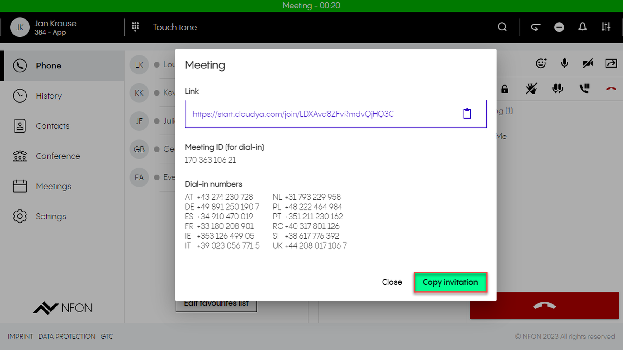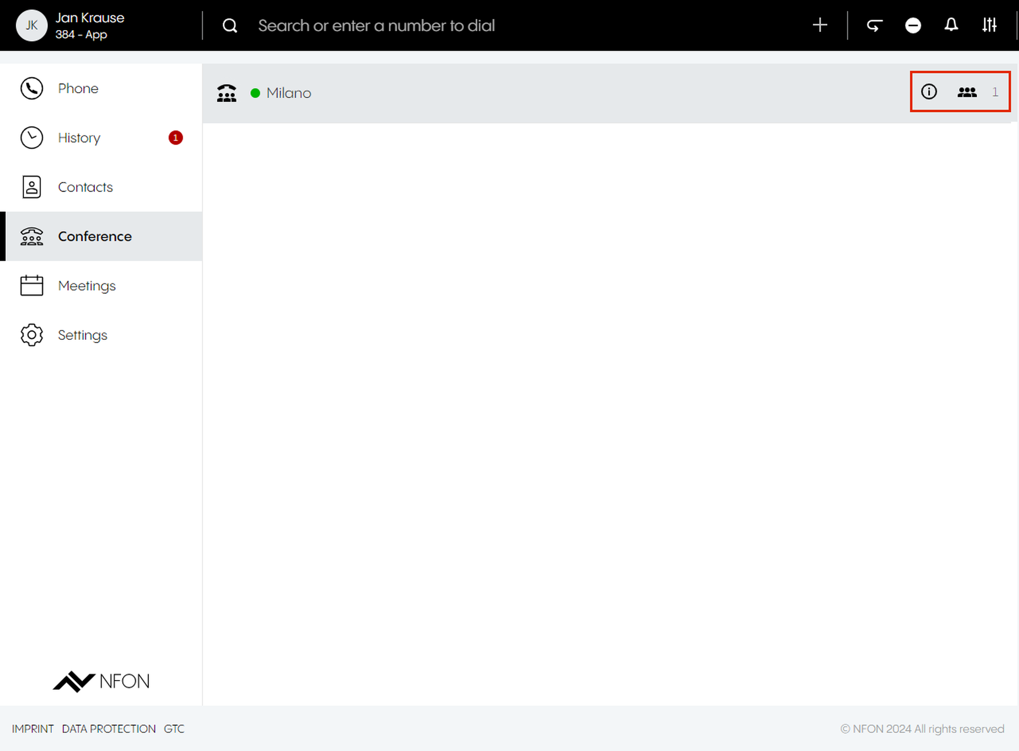 This is done by entering an optional participant ID when dialing in. The participant ID is displayed in the DFN VoIP-Centrex App Suite Client on the first device in the meeting information.