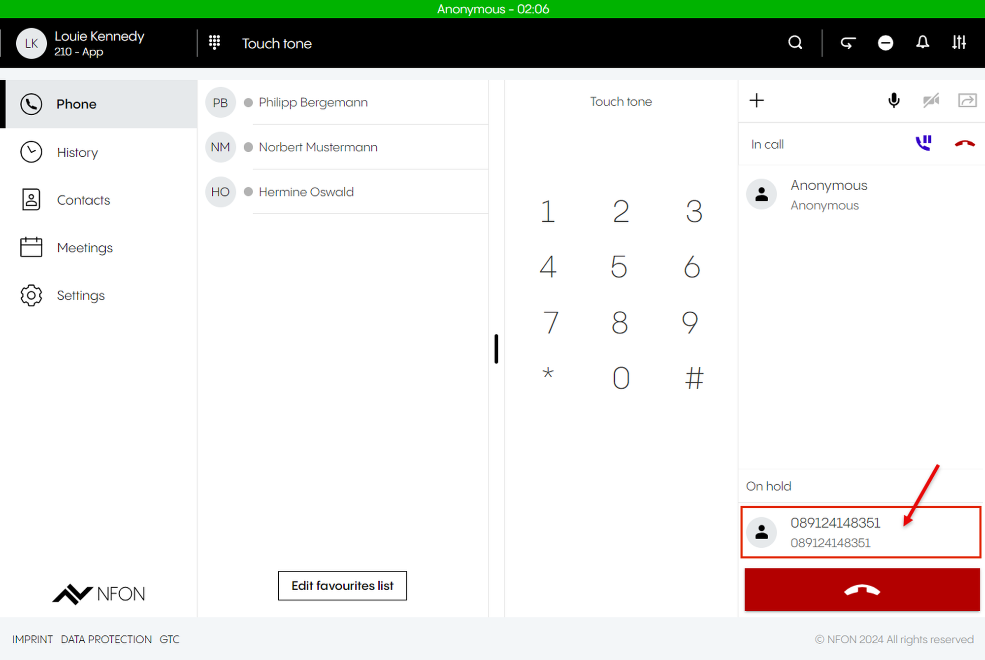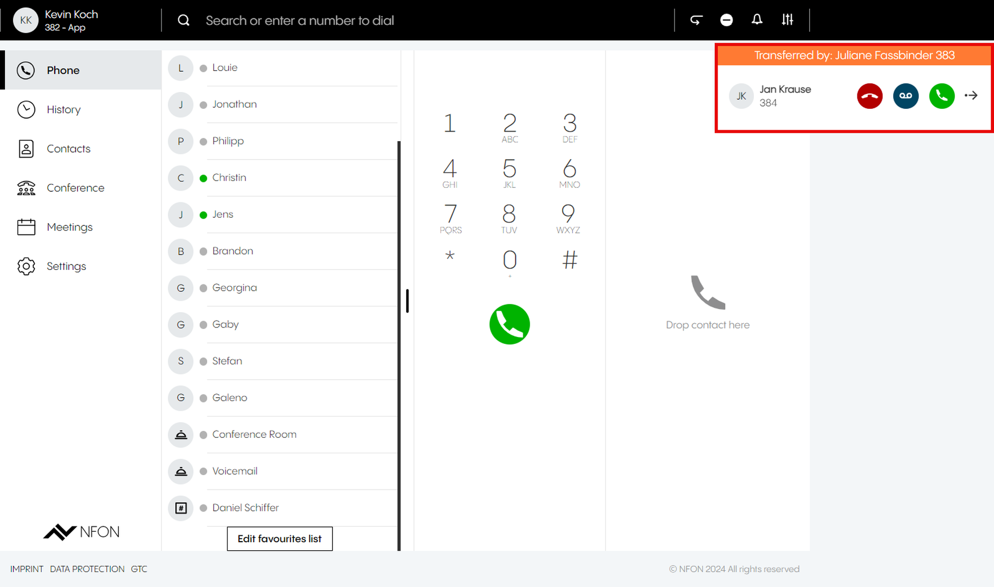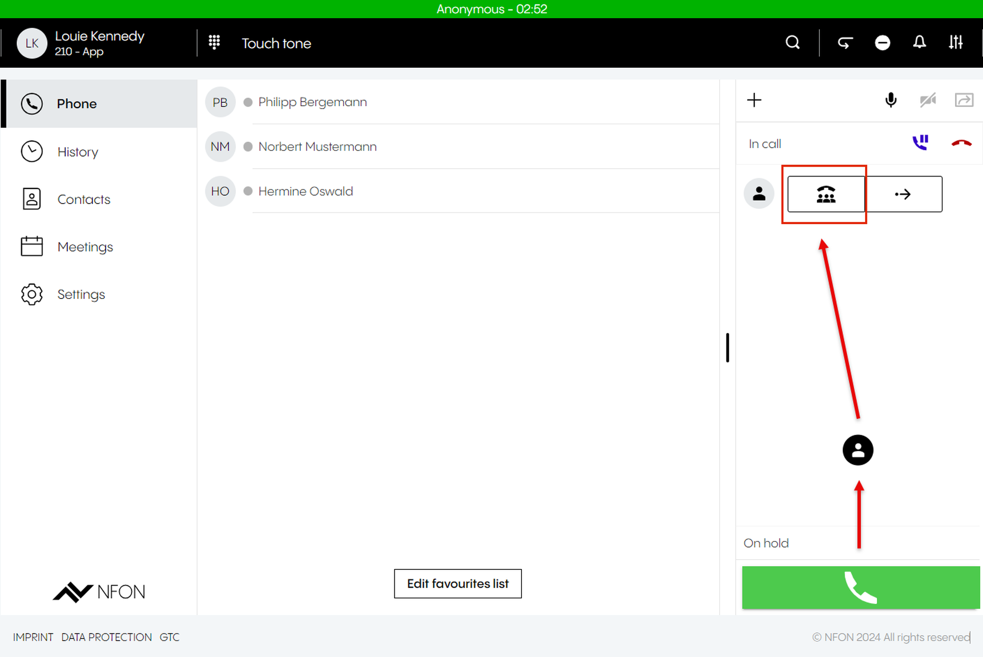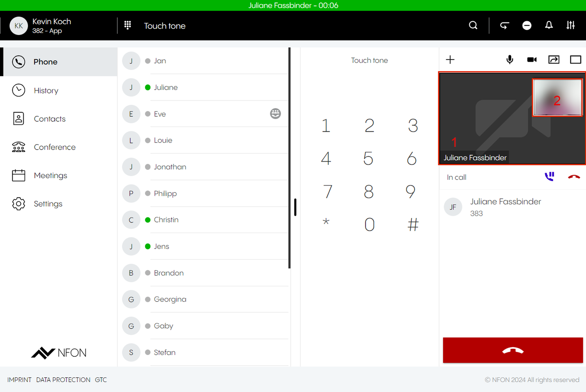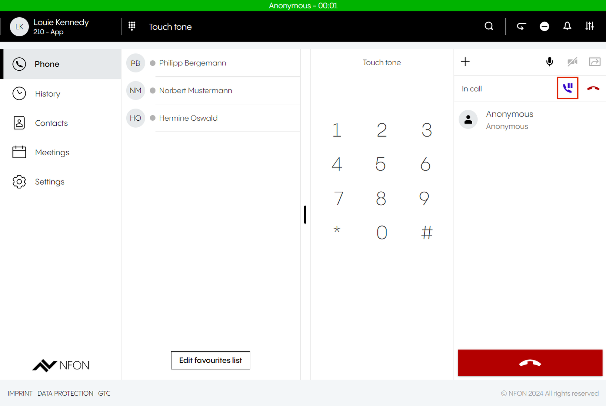 This is done by entering an optional participant ID when dialing in. The participant ID is displayed in the DFN VoIP-Centrex App Suite Client on the first device in the meeting information.