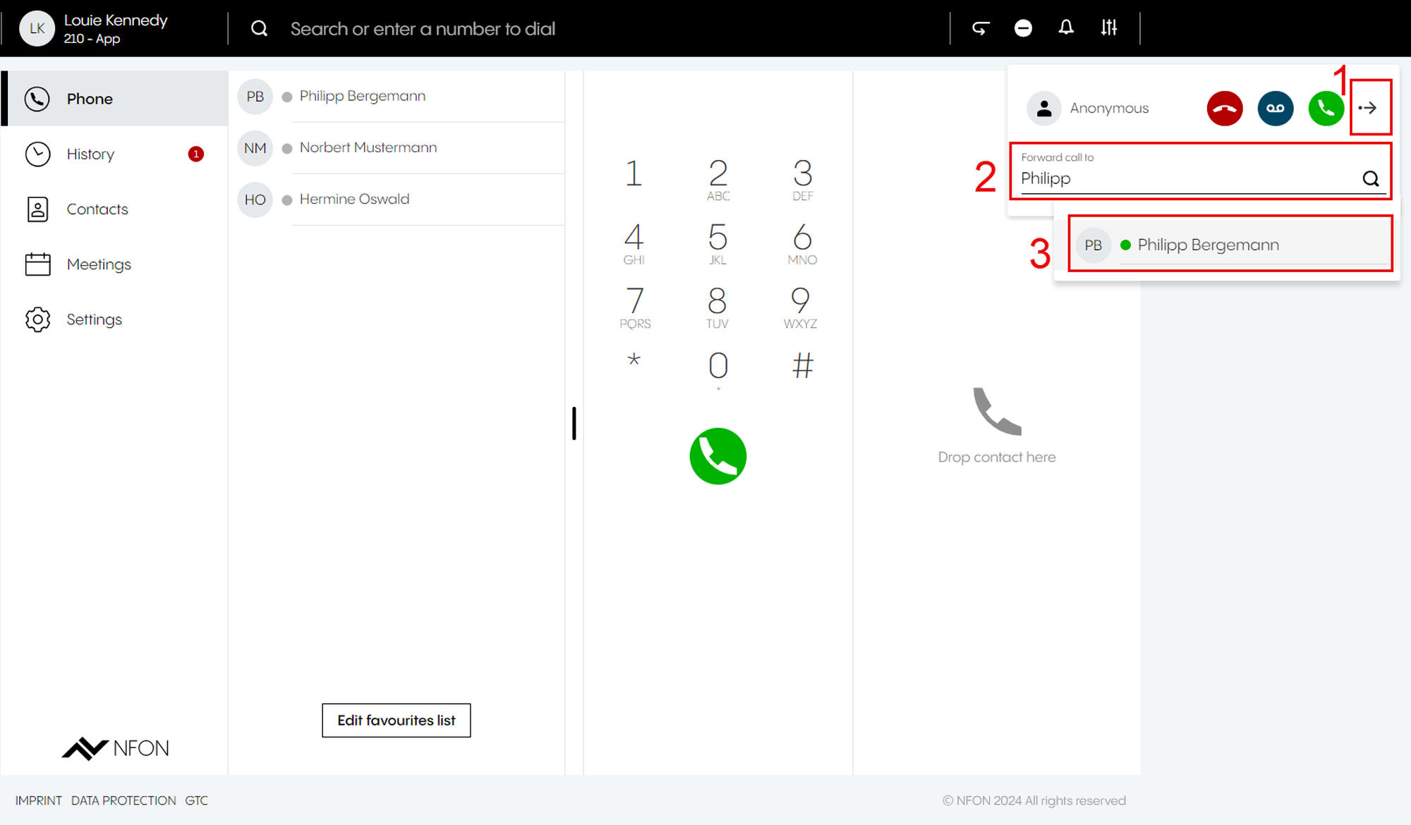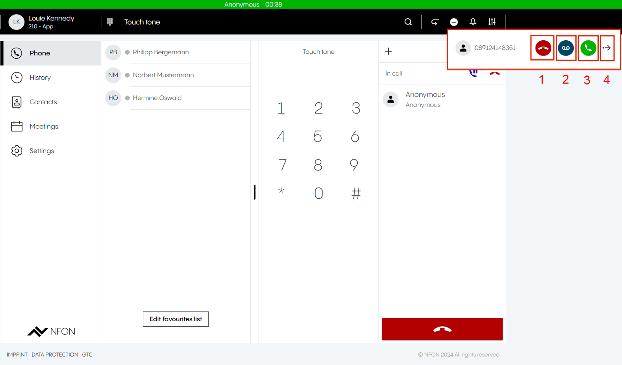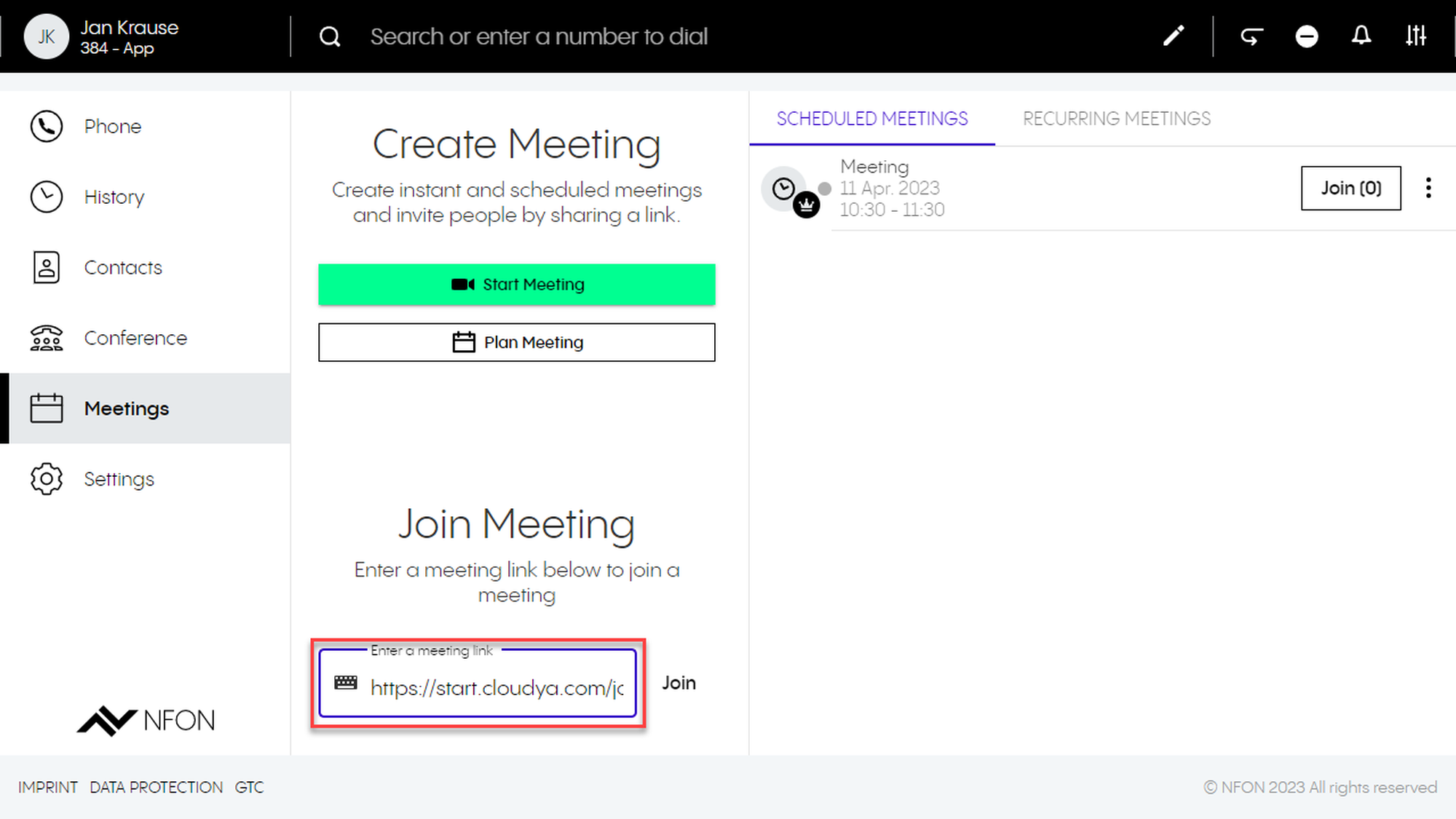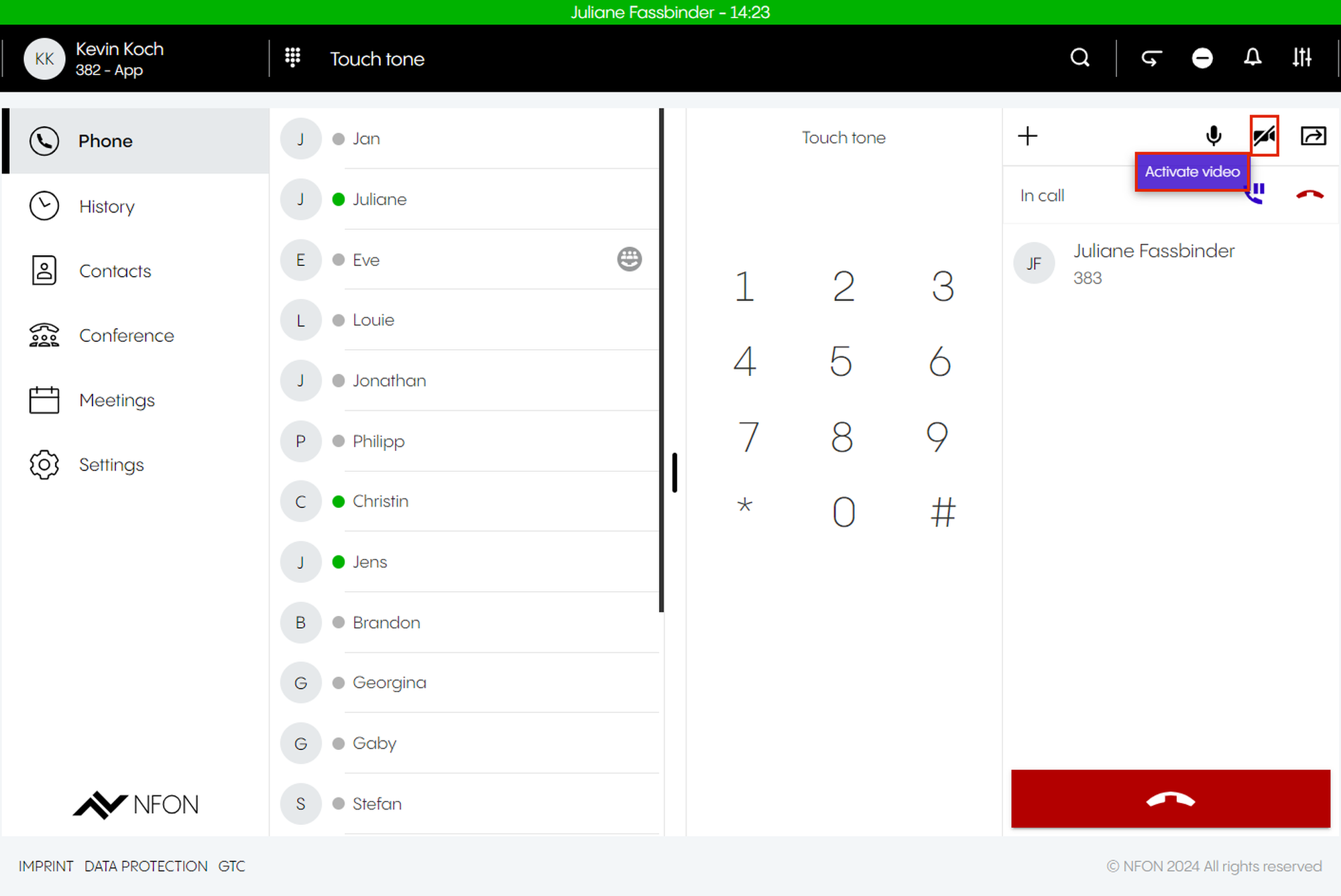 This is done by entering an optional participant ID when dialing in. The participant ID is displayed in the DFN VoIP-Centrex App Suite Client on the first device in the meeting information.