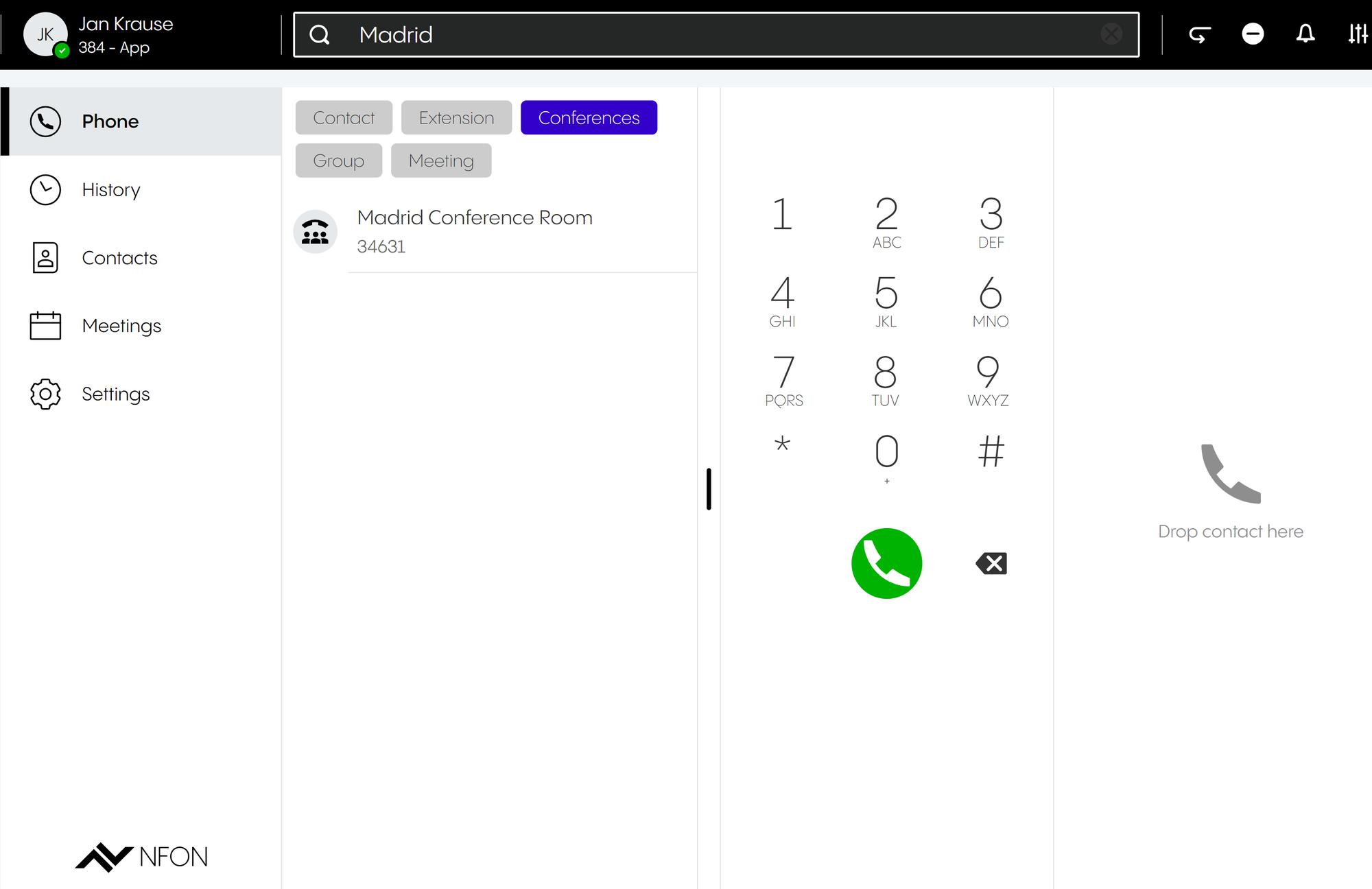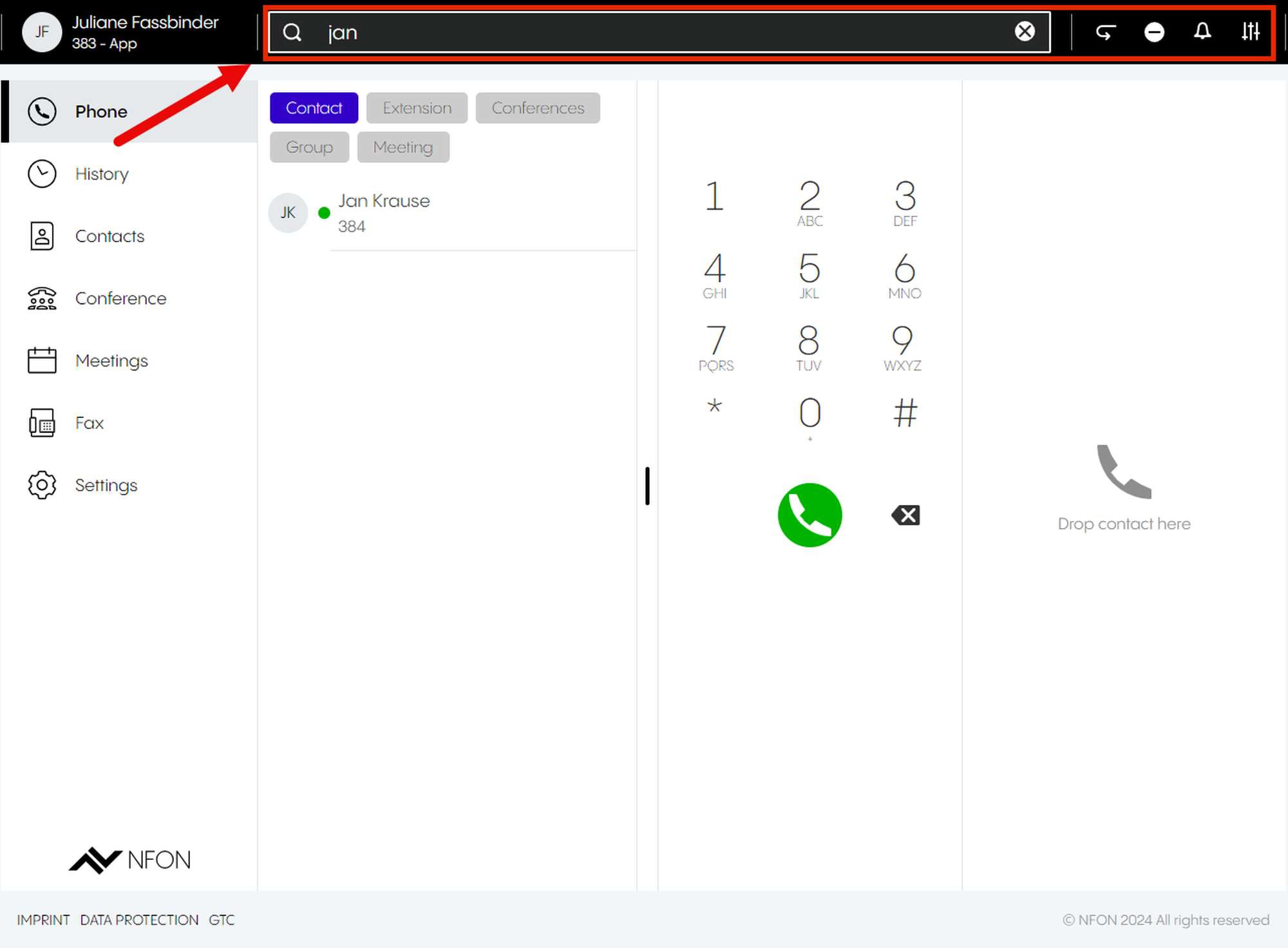 The search bar is used to browse contacts, extensions, conferences, meetings and groups. Search results are clustered into these categories.