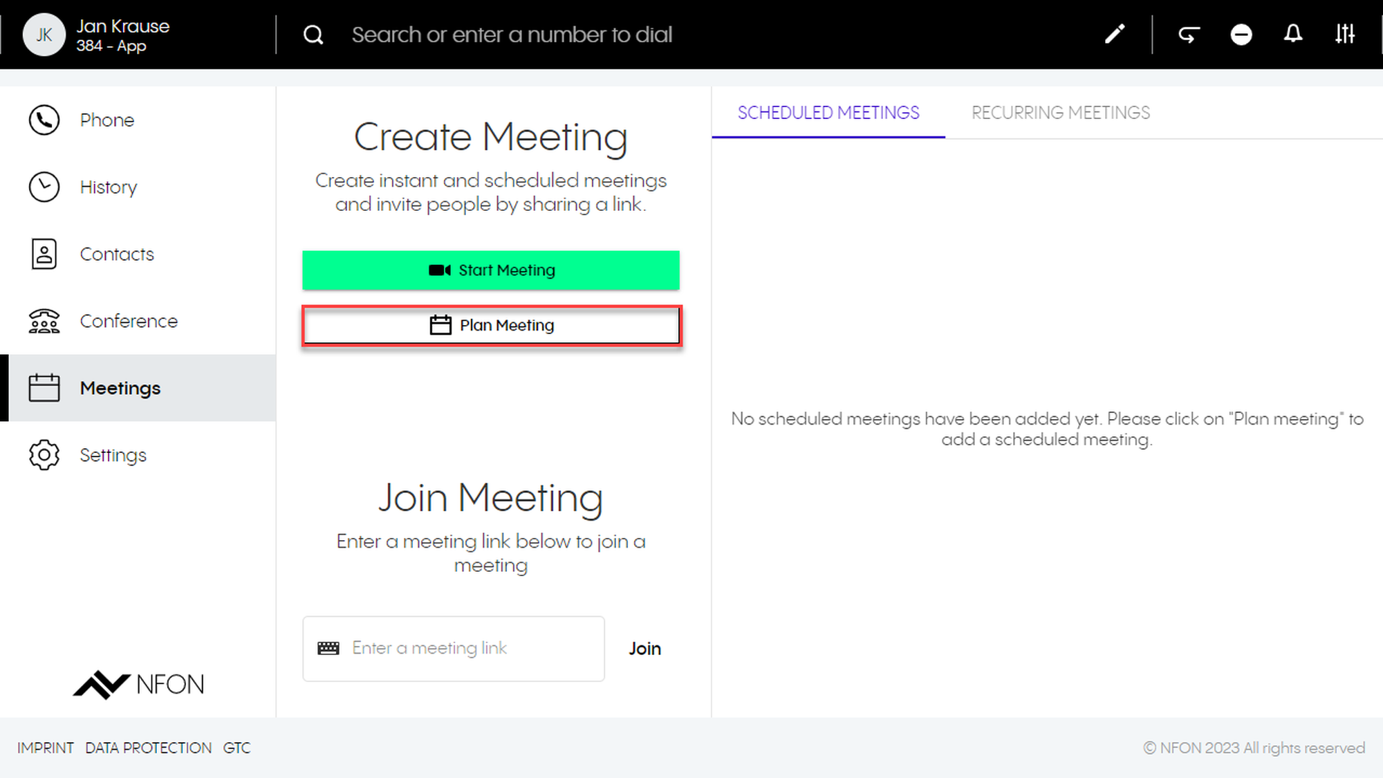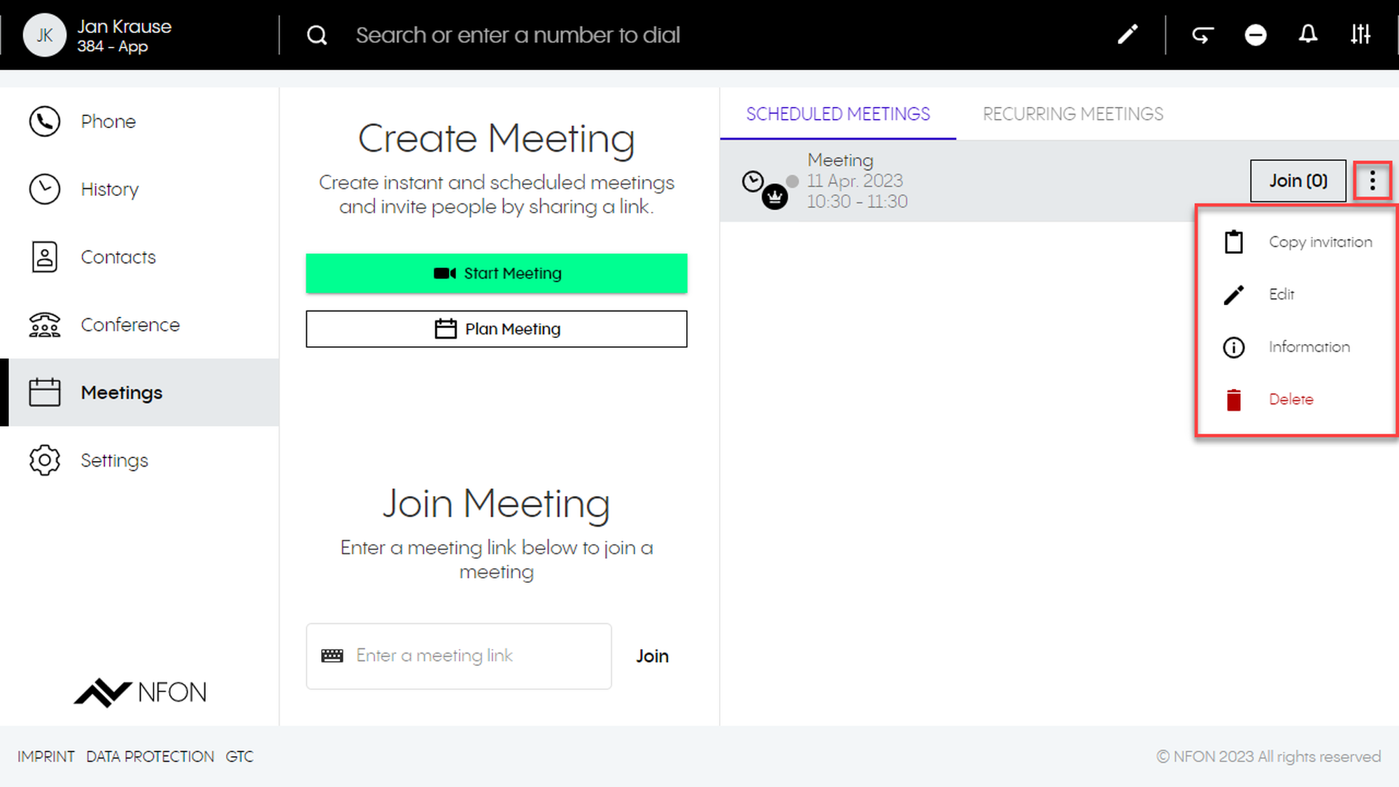 2. Open the options menu in the upper right-hand corner. Choose the DFN VoIP Centrex Meet & Share option and click on Add a meeting.