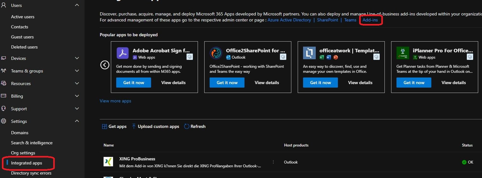 2. Go to Integrated apps under Settings > Integrated apps in the menu on the left hand side and click on Add-ins.