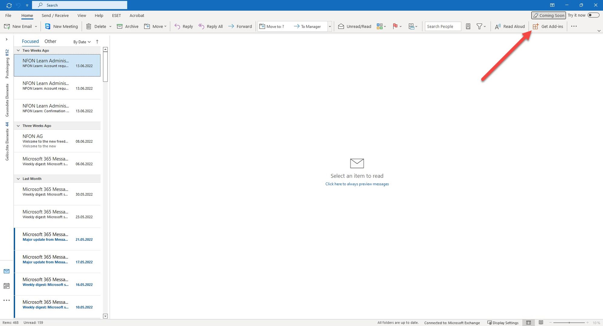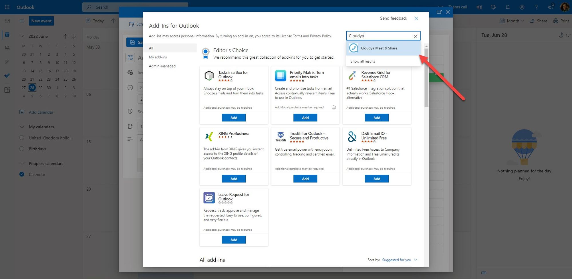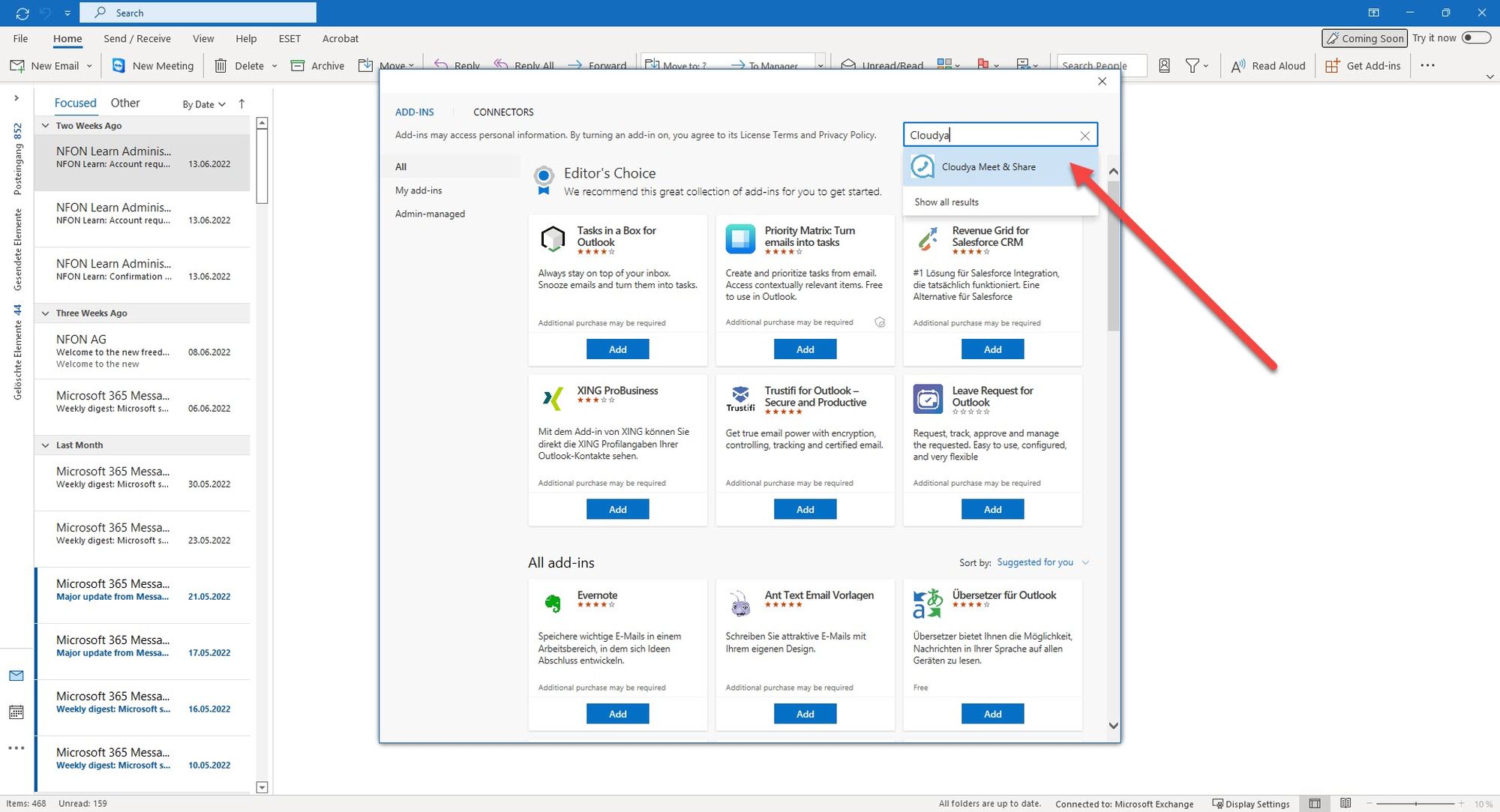1. Click on the Get Add-ins button in the upper right-hand corner. The Outlook Add-ins window opens.
