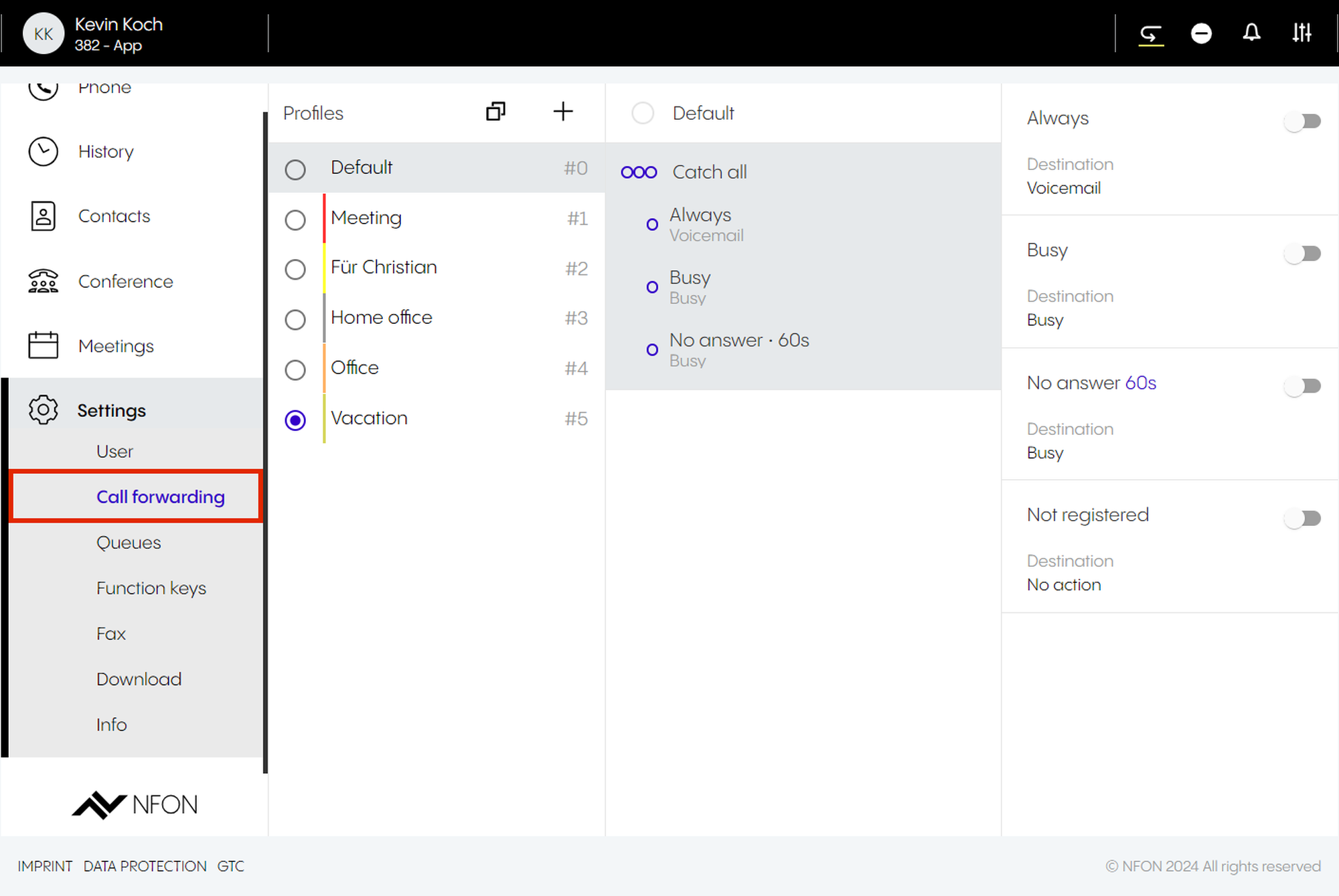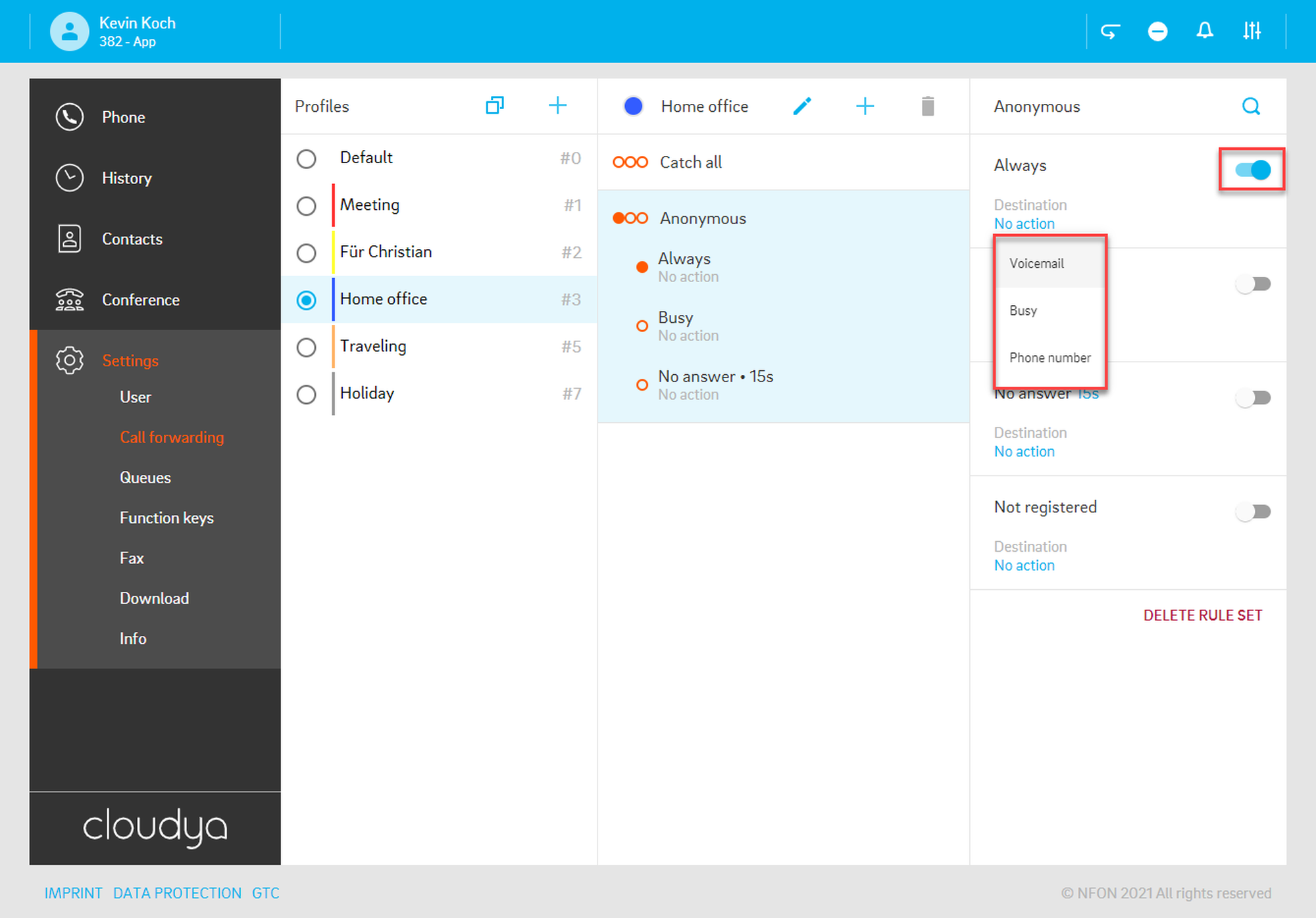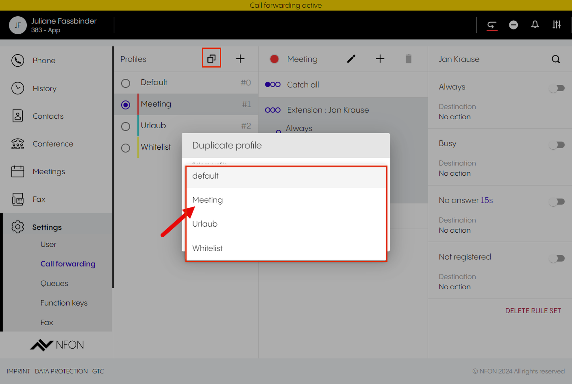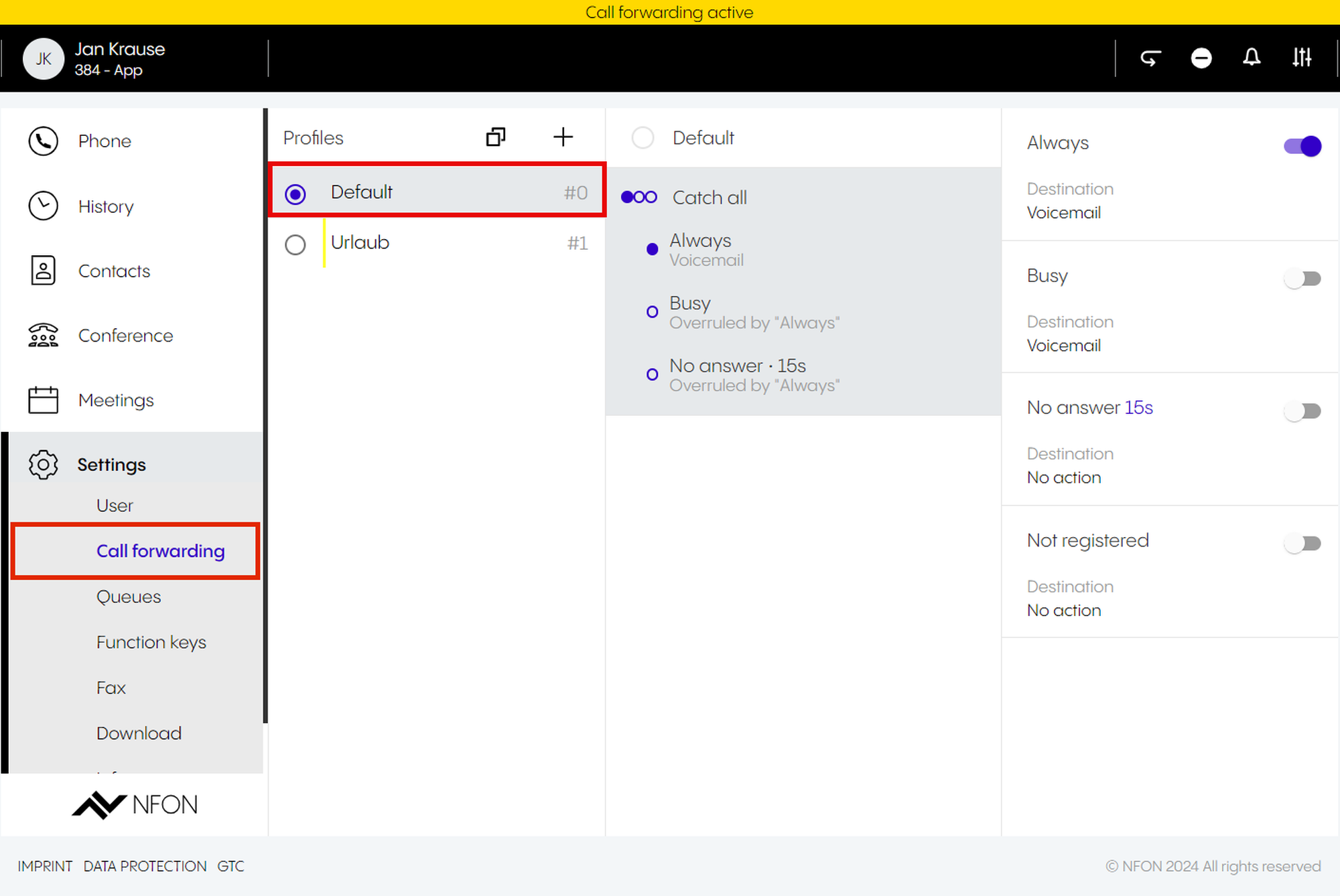 Per default, the app is set as your primary device – the target you will call with. This means, once you have an incoming call, your app will ring. If you want to change this, select a different device.
