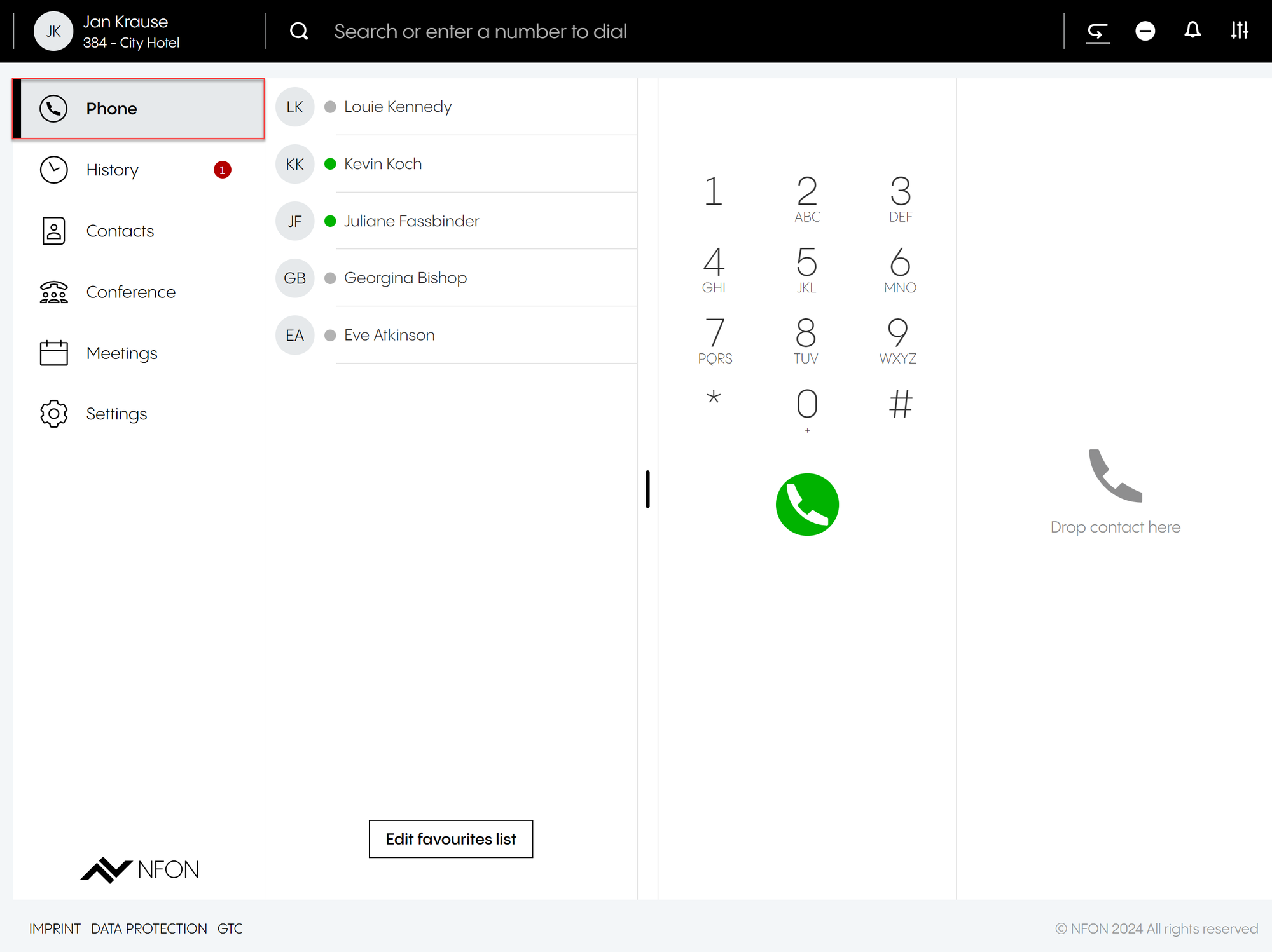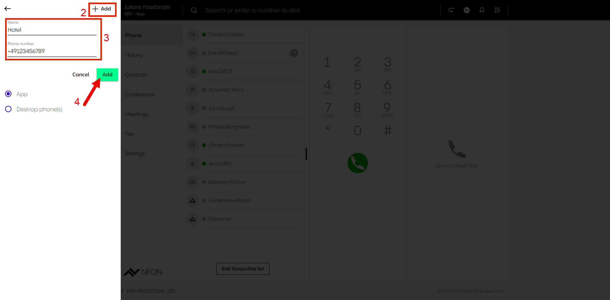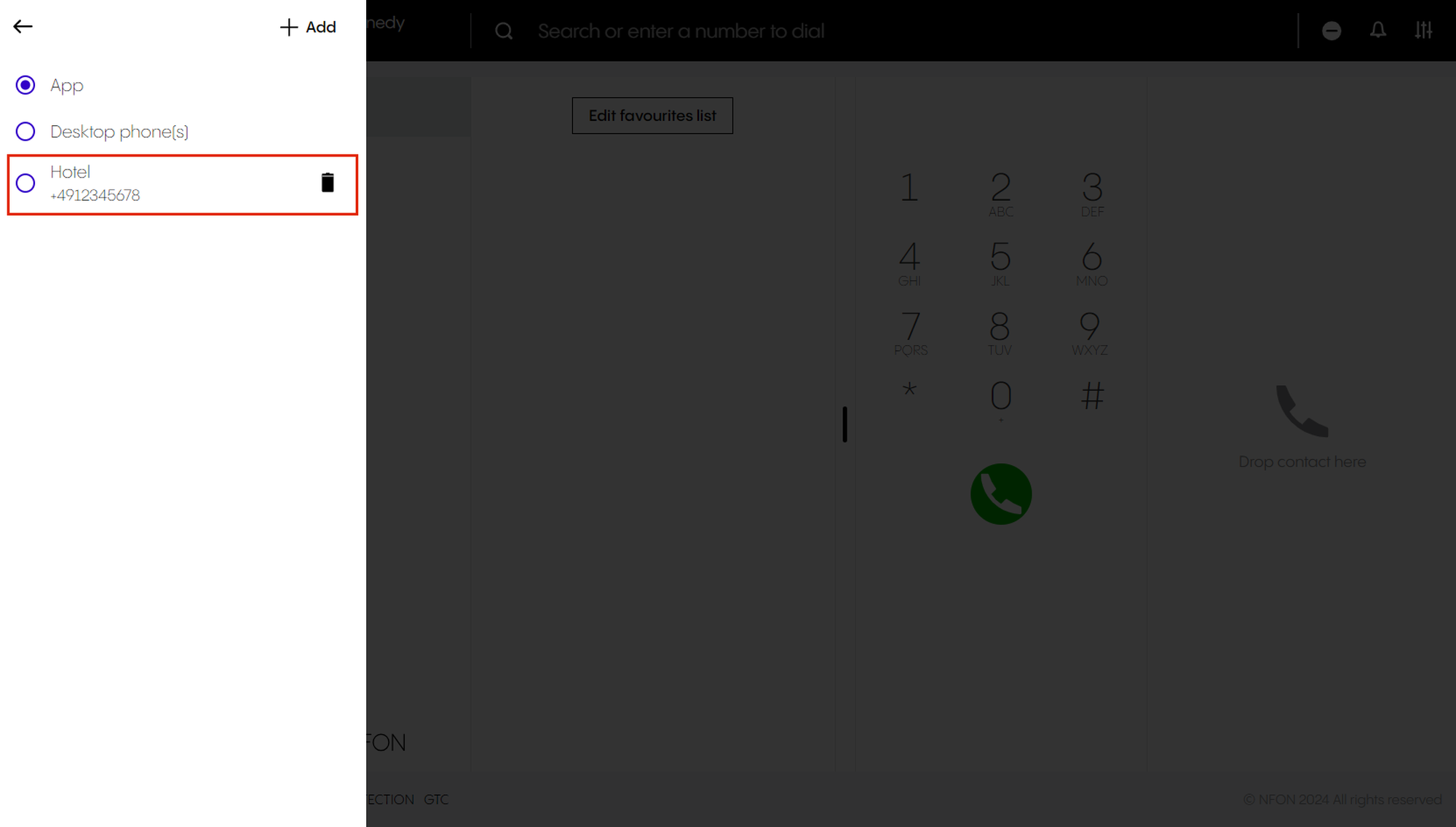 ⇒ The new device (here, the hotel room phone) is now selected as the device to make calls with.Dial the number you would like to call.