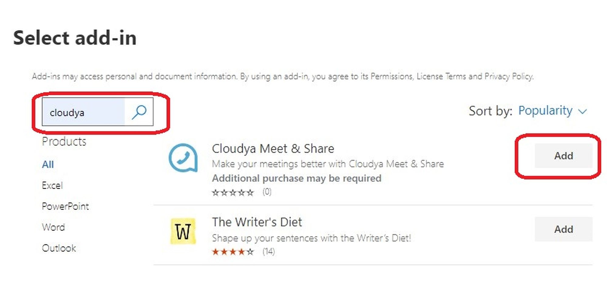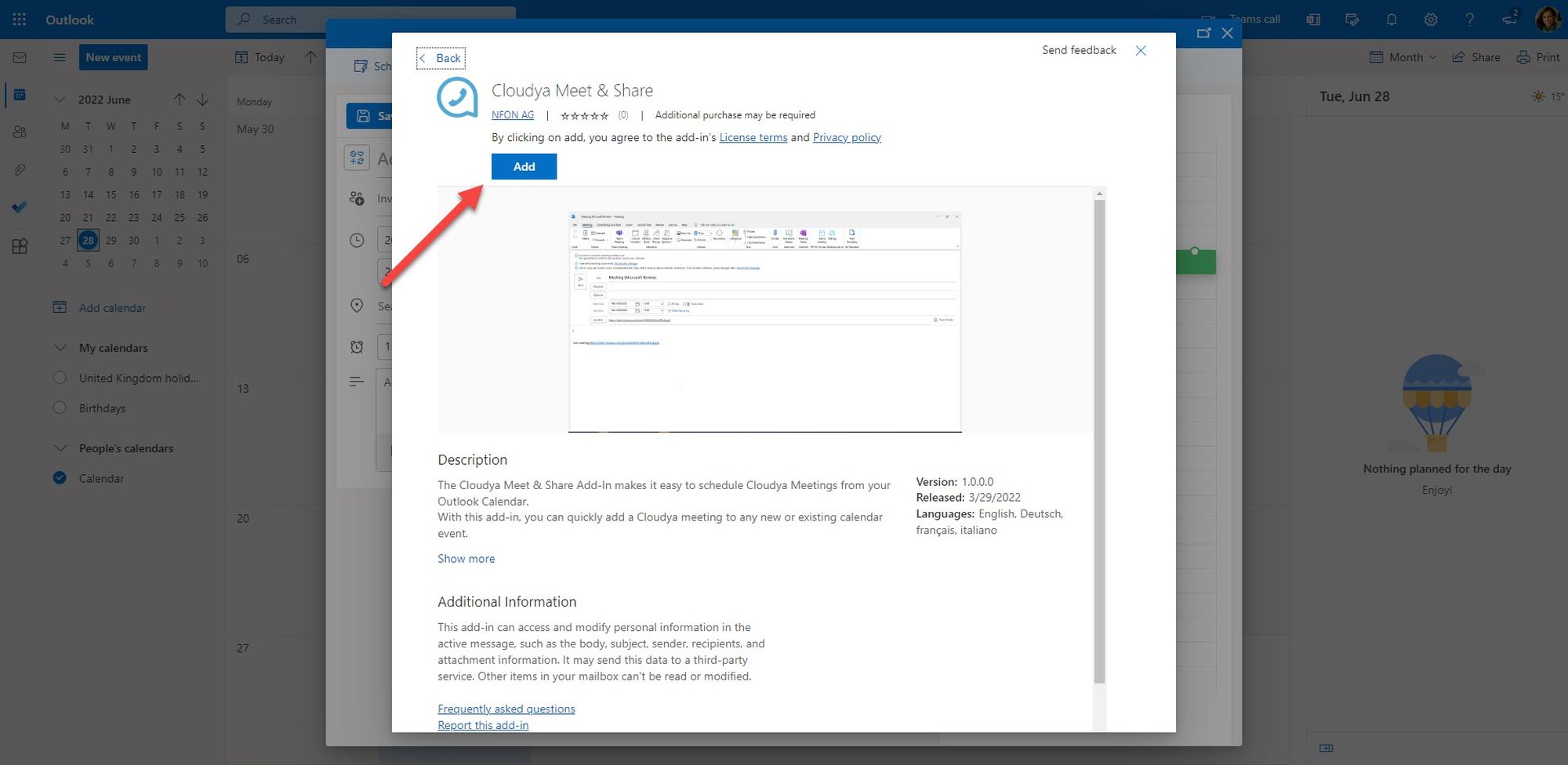 5. Search for DFN VoIP Centrex Meet & Share in the store and click on Add. To install the add-in, you have to agree the license terms and privacy policy by clicking on Continue.