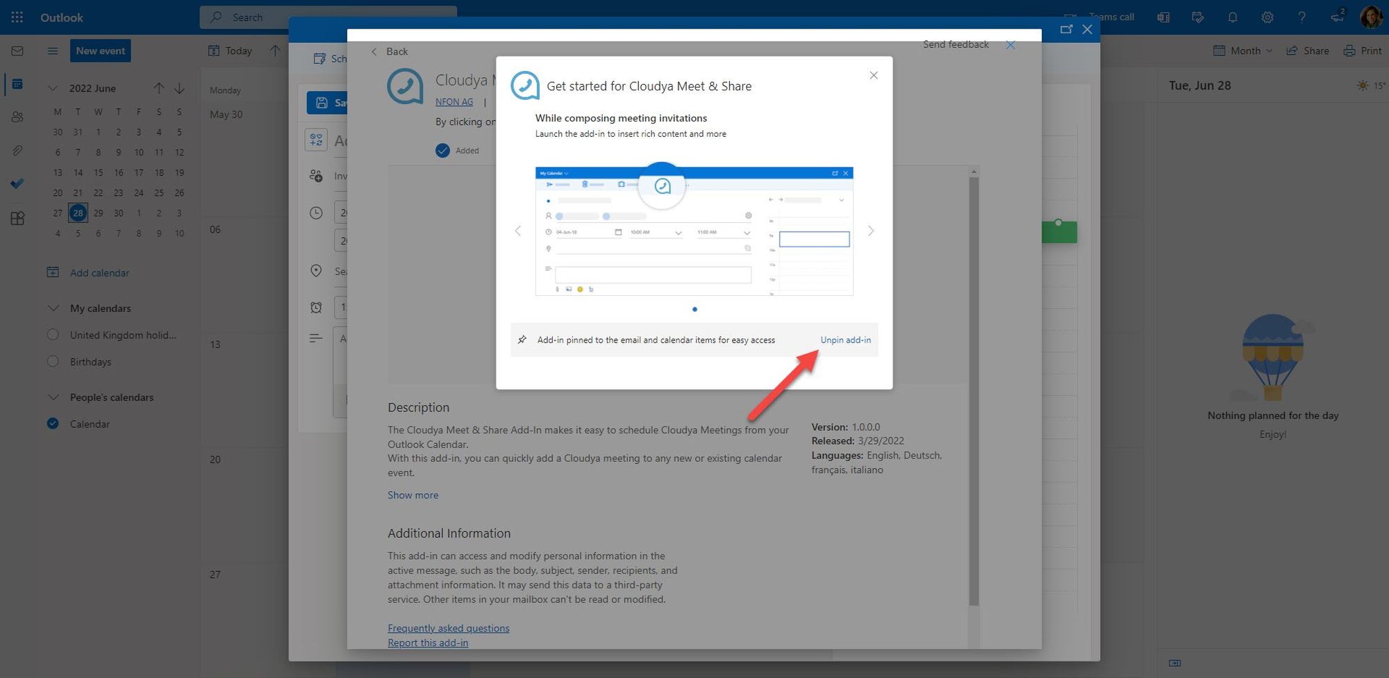 6. You have installed the DFN VoIP Centrex add-in. In addition, you will get a notification about the DFN VoIP Centrex button that has been pinned to your taskbar. If you don’t want the button to be pinned, click on Unpin Add-in in the bottom right-hand corner. You can still use the Cloudy add-in via the Options menu.