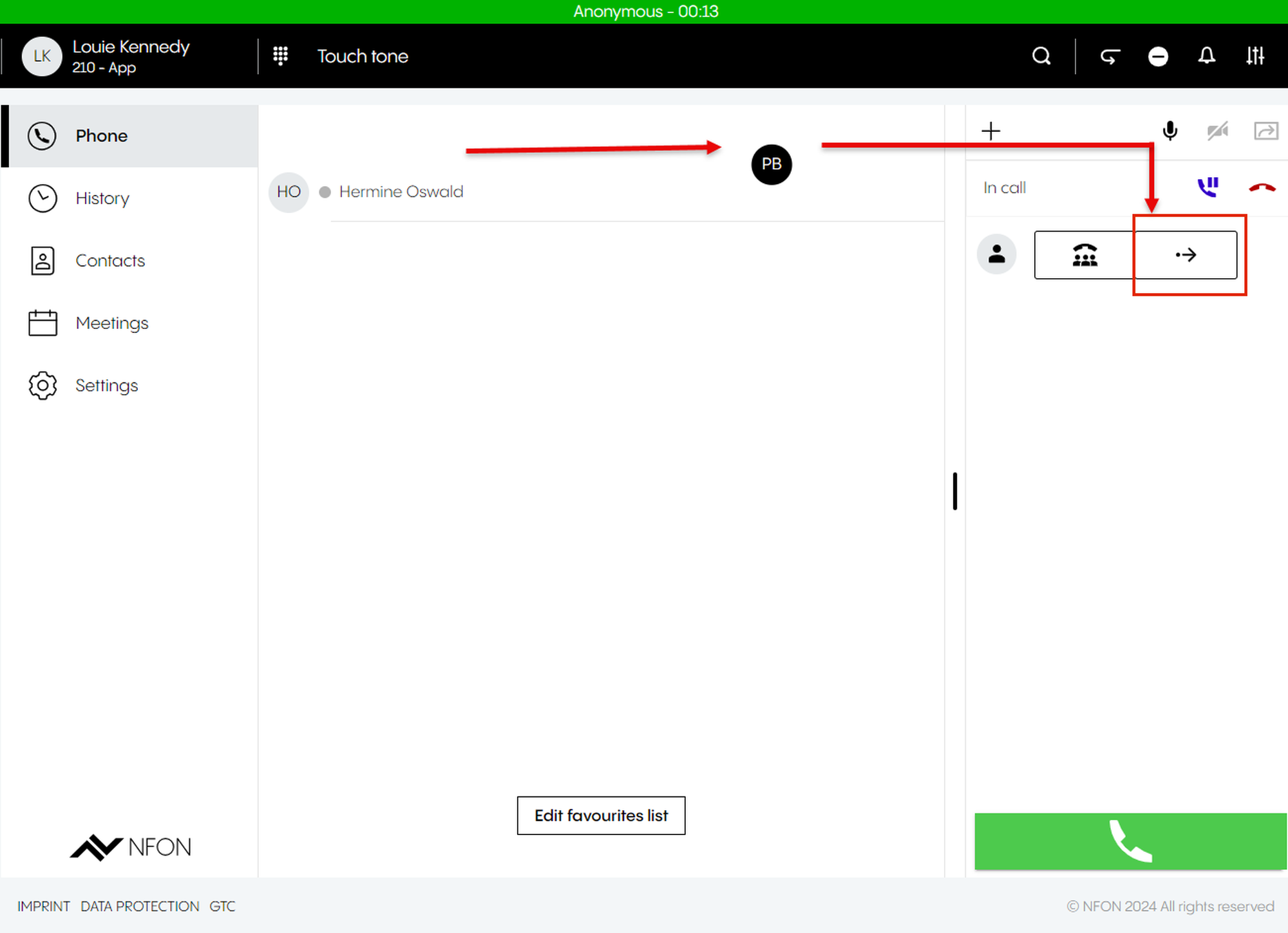 ⇒ The selected device (here, the hotel room phone) will ring.Accept the call.