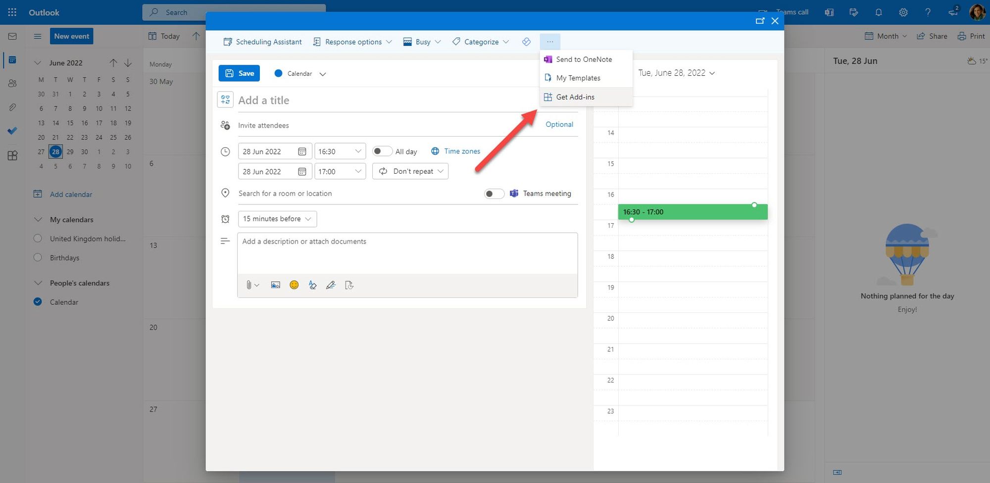 1. Open your Outlook calendar and create a new event (meeting or appointment).