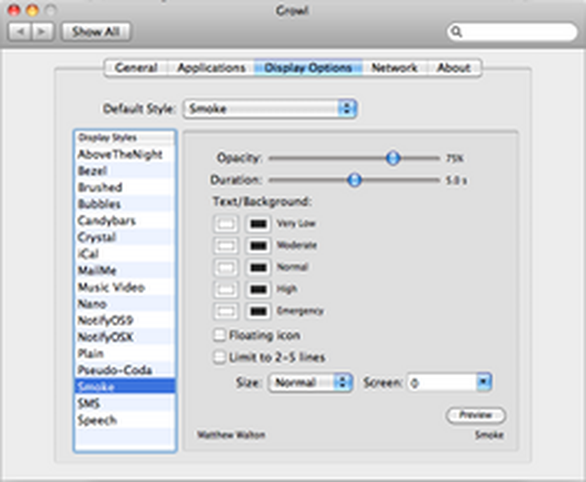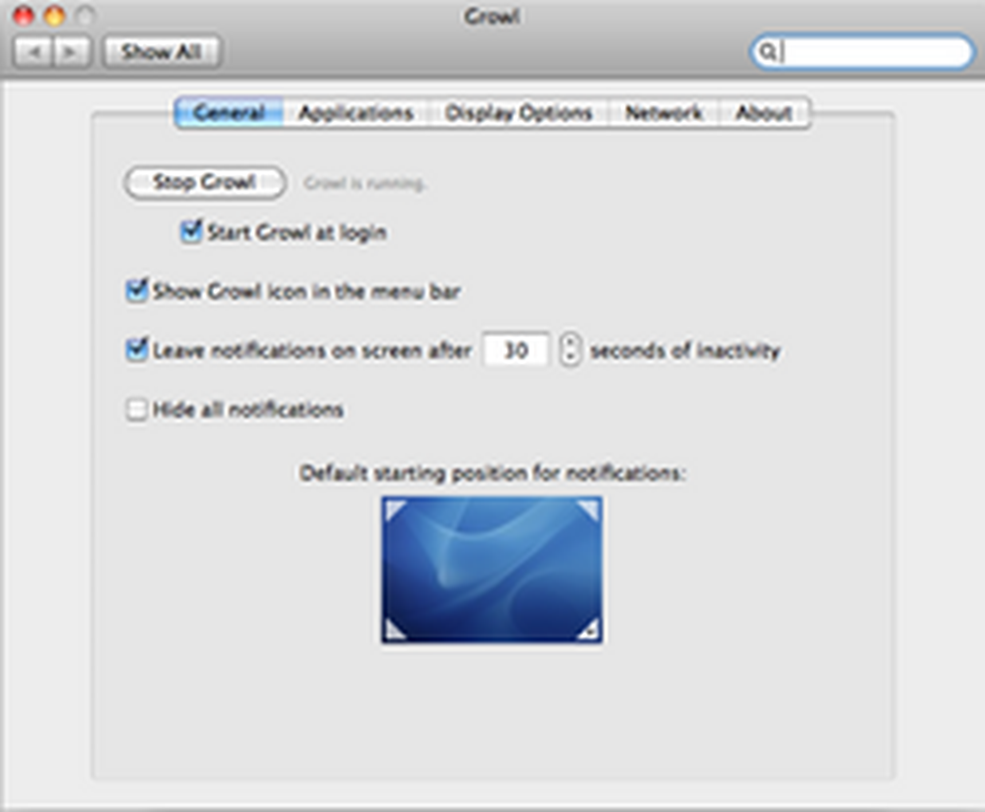 The window “General information” allows you to configure basic settings, e.g. how long to display notifications or what starting position these have.We recommend activating the function “Start Growl at Login”.