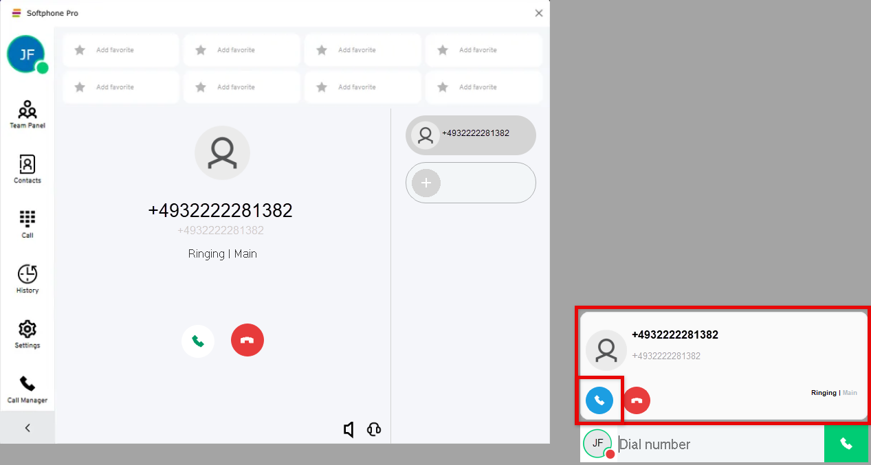 You can open an additional call tab during an incoming call, enter a number on the keypad or in the Call Manager and drag the call tab of the incoming call to a number via drag & drop.