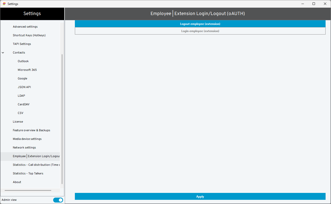 ⇒ Employee | Extension Login/Logout (oAUTH) appears in the side menu.Select Logout employee (extension) or Login employee (extension)