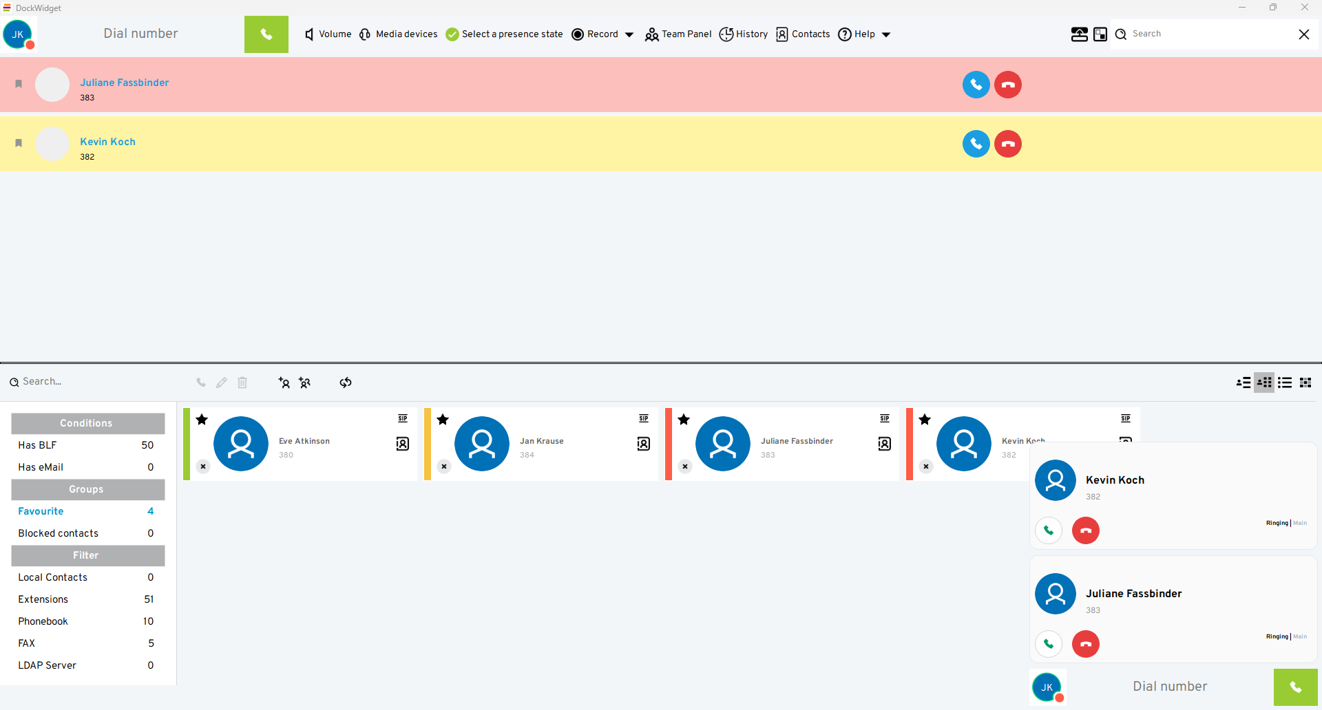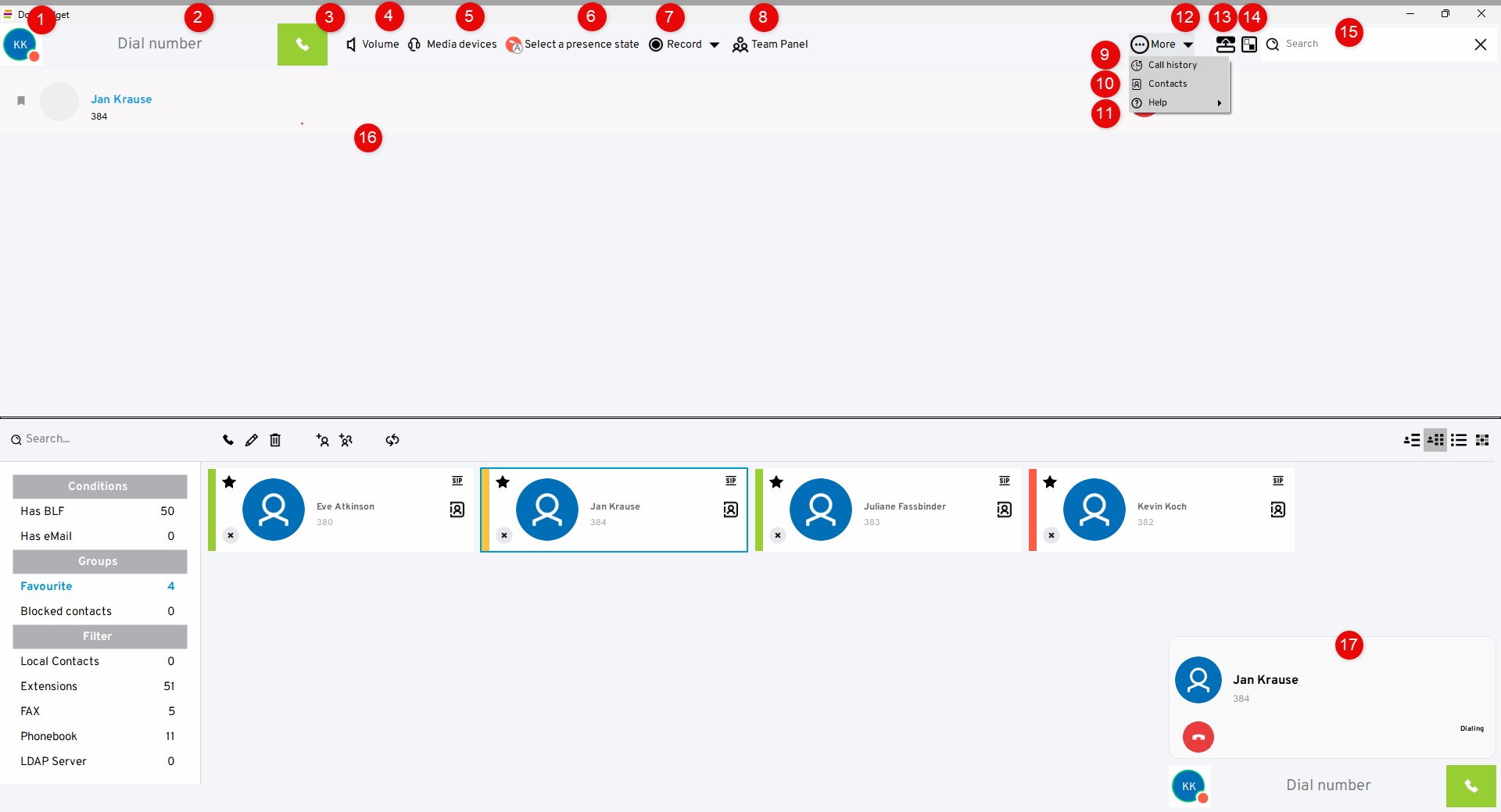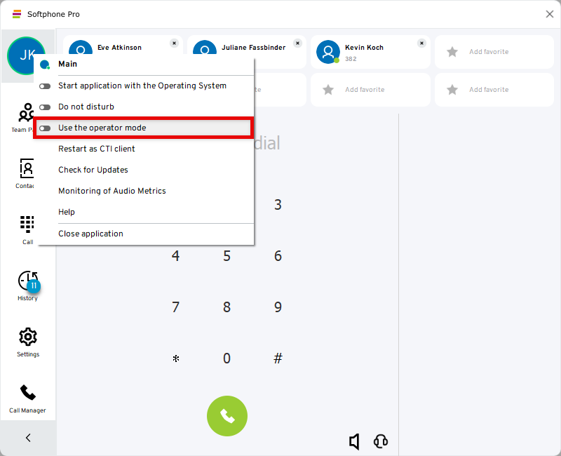 The user icon in the upper left-hand corner serves as a status indicator and shows you the connection between your telephone system and your softphone.