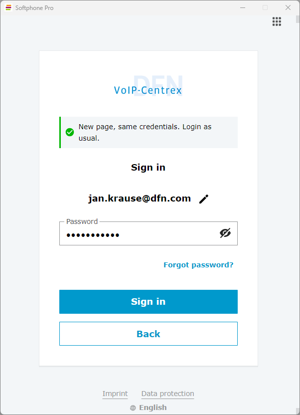 ⇒ A Login window opens.Enter your DFN VoIP-Centrex email address and password.