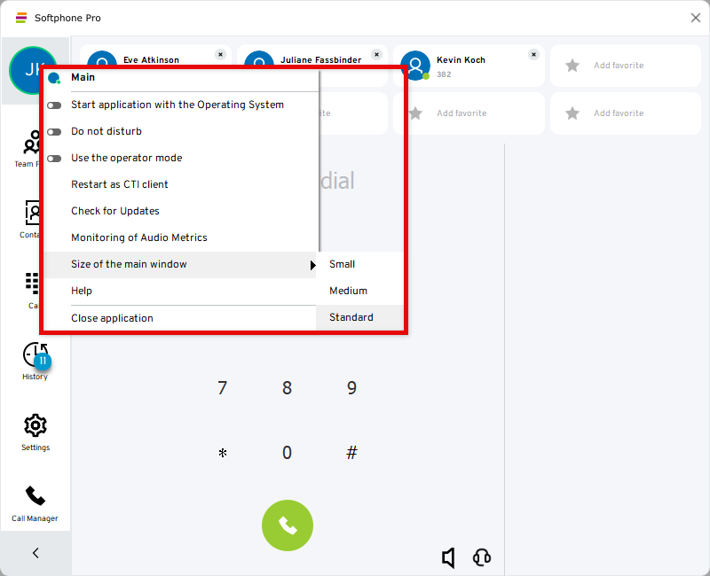 Note: Changing the window size restarts the Softphone Pro client.Open Help (opens the web browser to the Softphone Pro documentation)